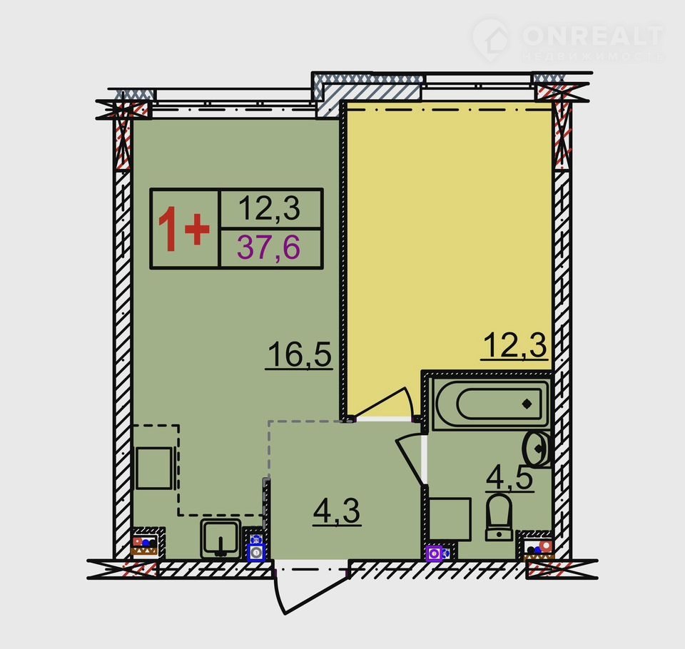 Общая площадь 37.6 м2