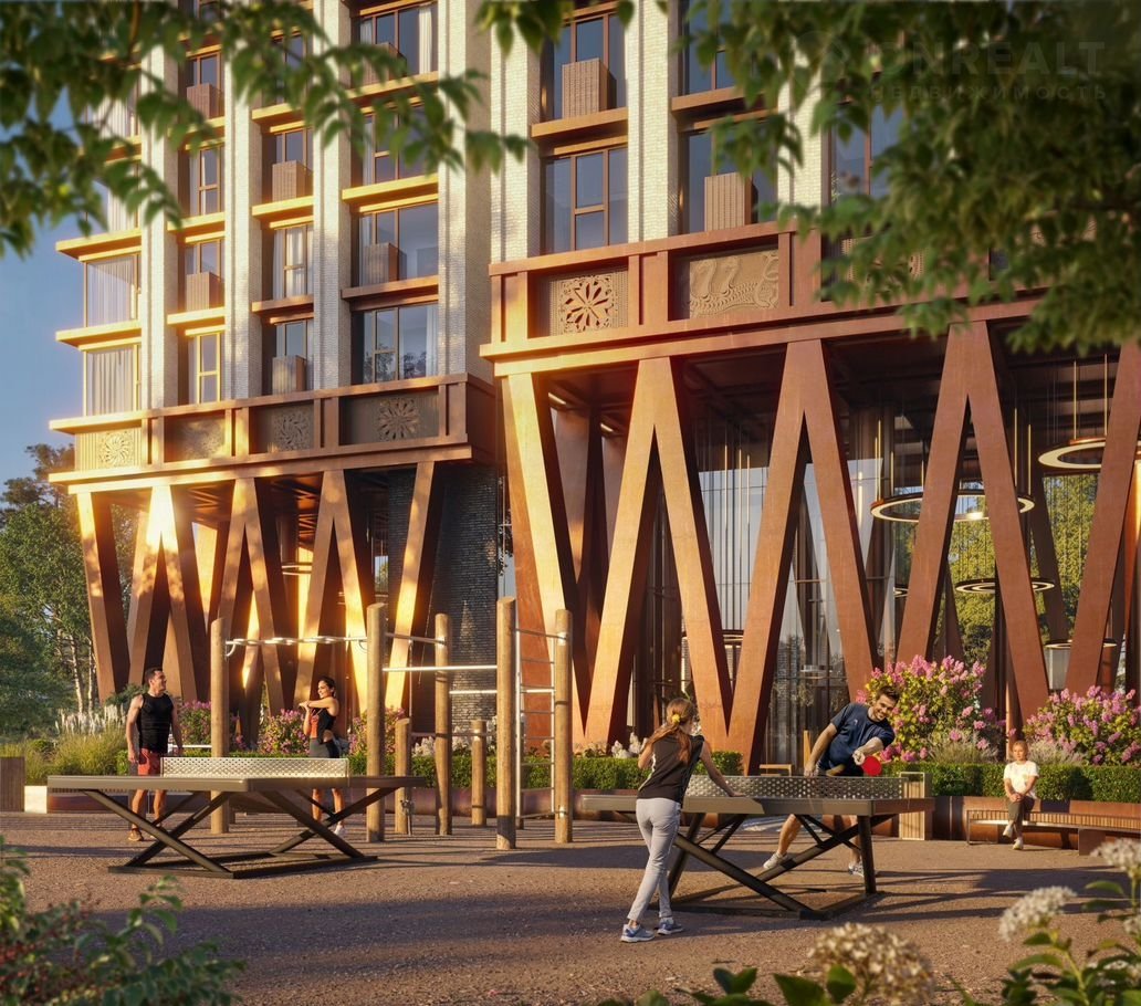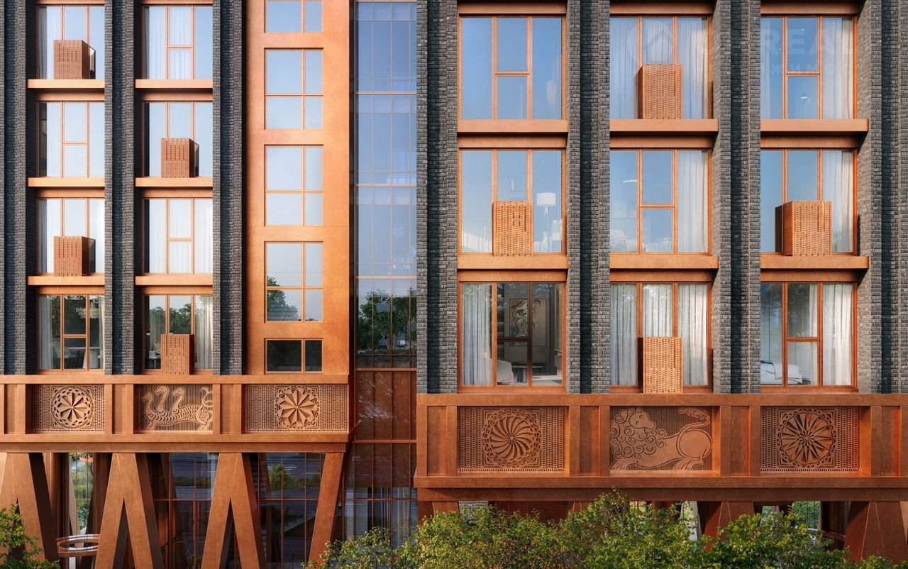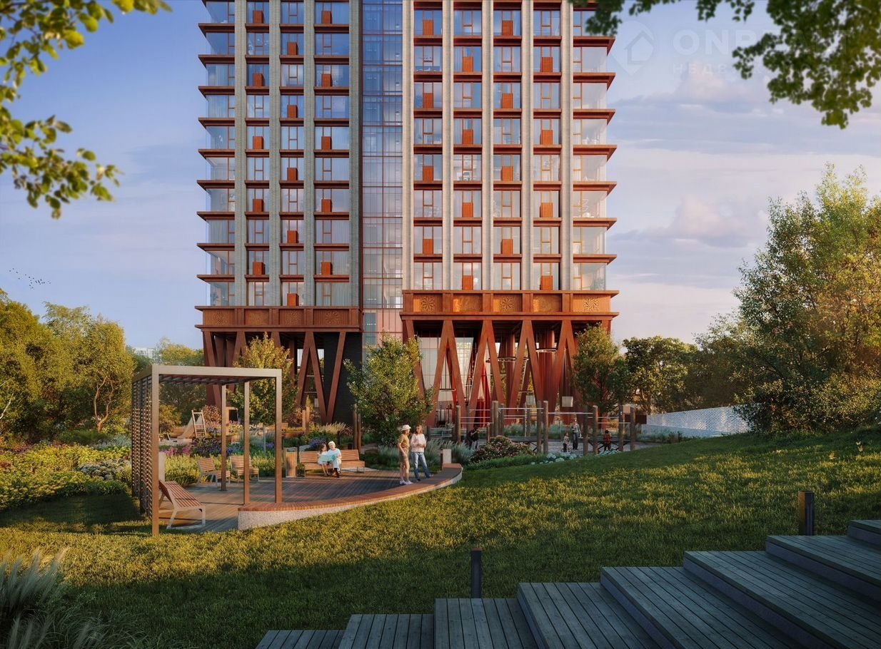 Архитектурный проект нового жилого комплекса был разработан именитым бюро «Остоженка». Отделка фасадов выполнена из кирпича и кортеновой стали, что в сочетании с панорамным остеклением, придает ему выразительный облик. Первый этаж запроектирован на высоте 13 метров. Таким образом, просторная входная группа имеет высоту потолков 10 метров, что делает ее интерьер уникальным. Благодаря расположению и продуманной архитектуре из каждой квартиры как на верхних, так и на нижних уровнях будут открываться живописные виды.