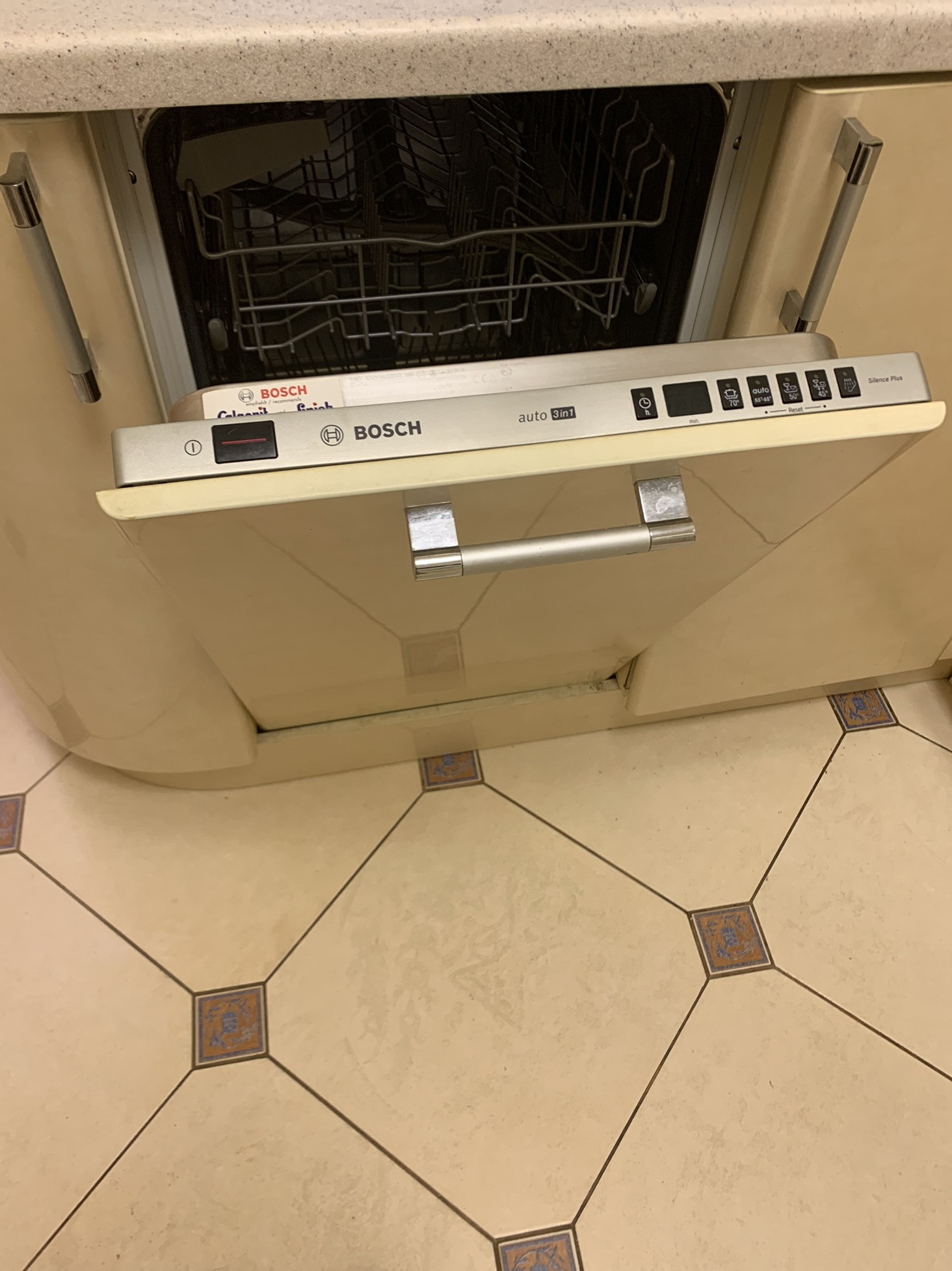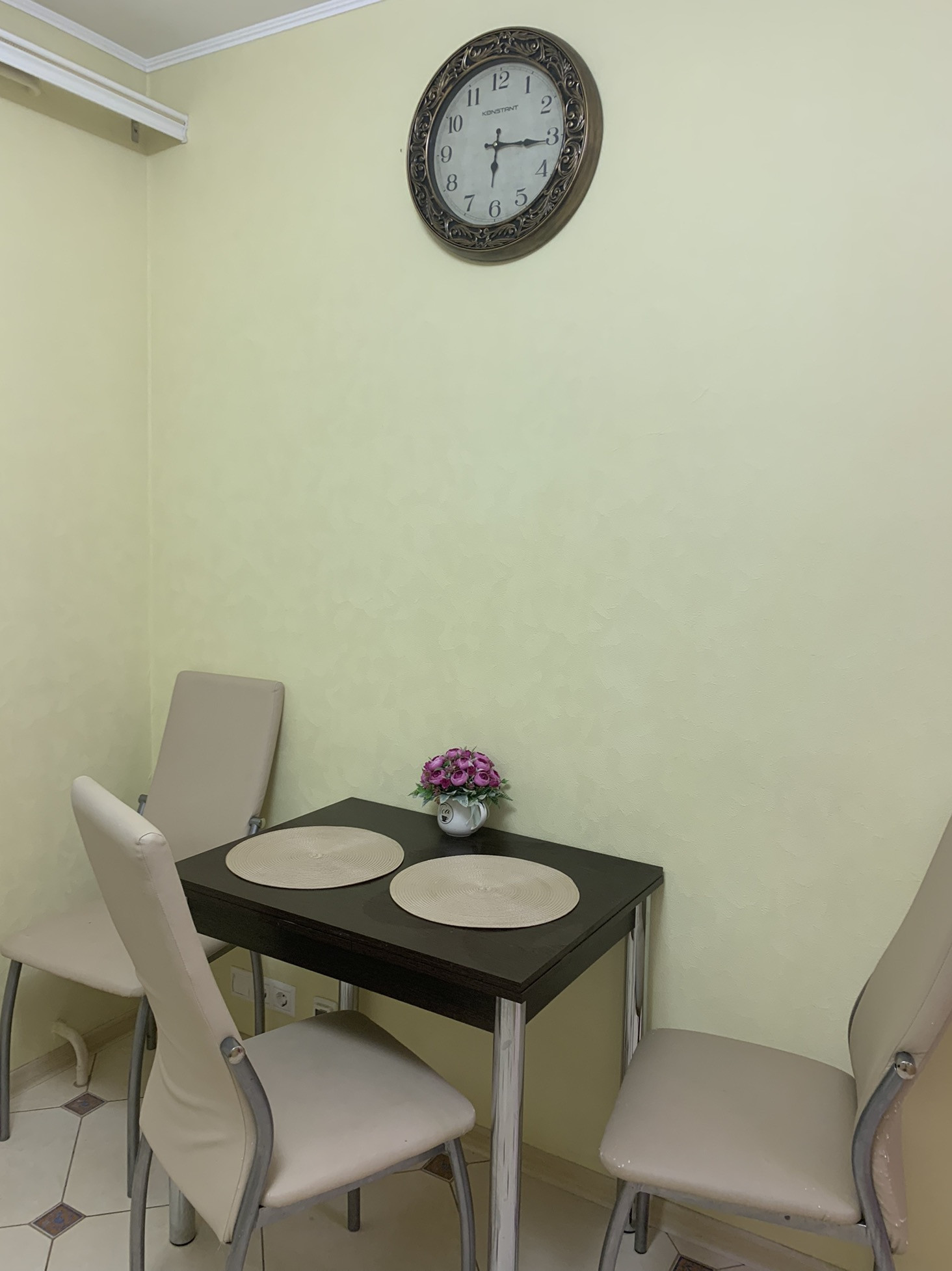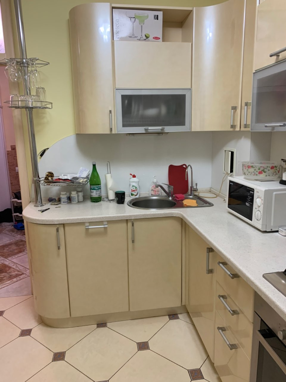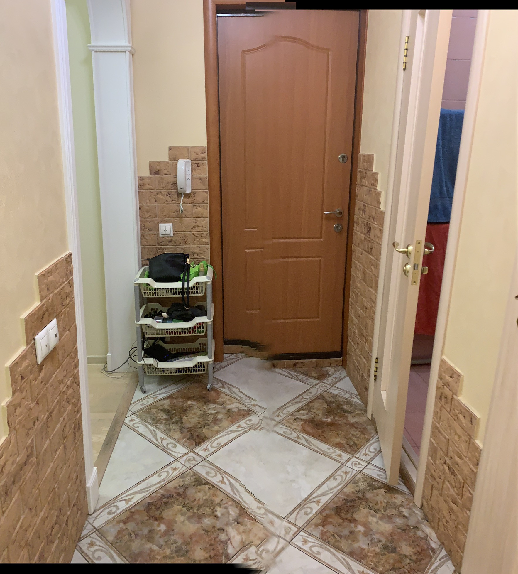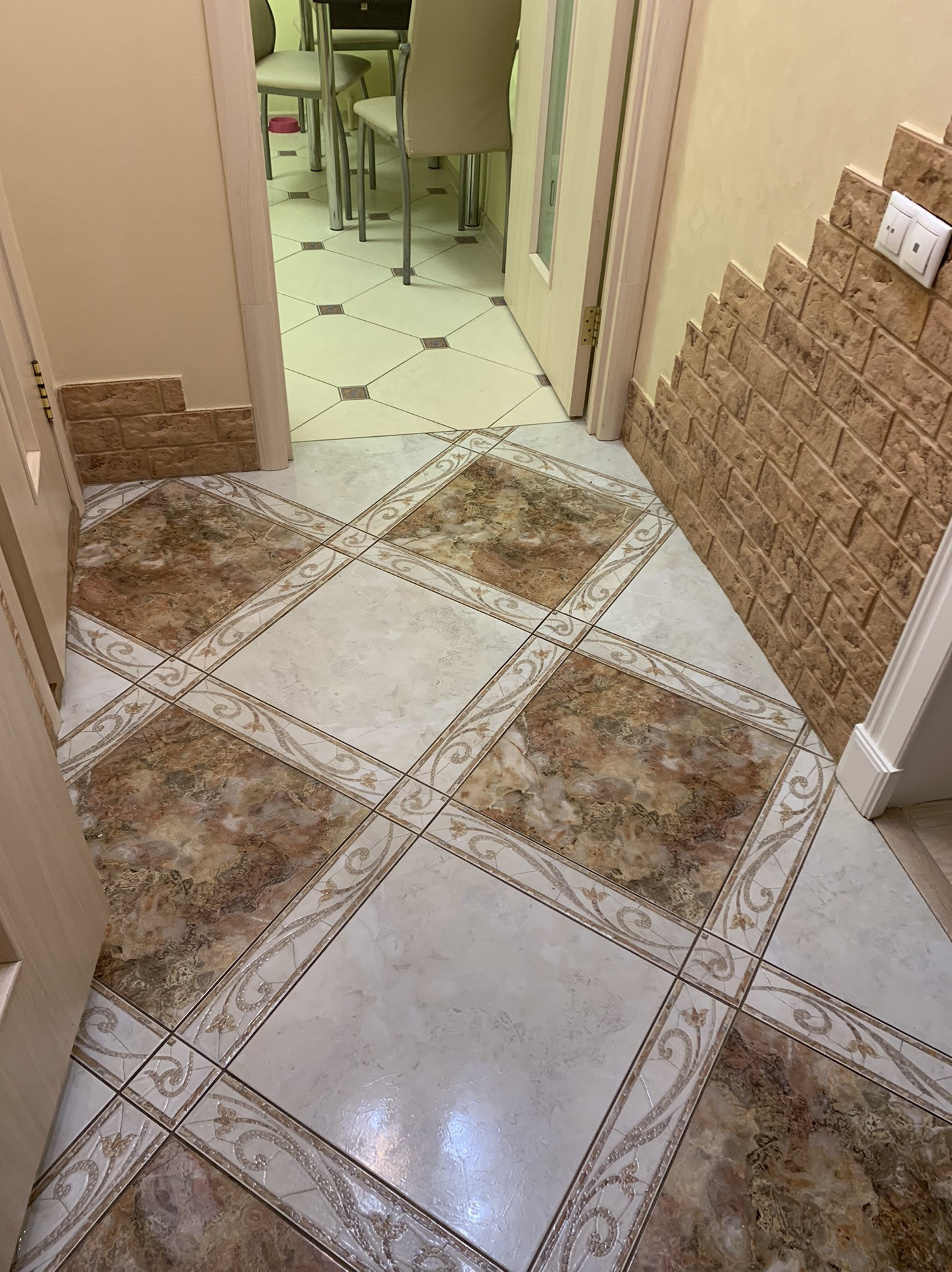 На кухне пол- плитка Керама (теплый пол), на входе - керамогранит с красивым рисунком.