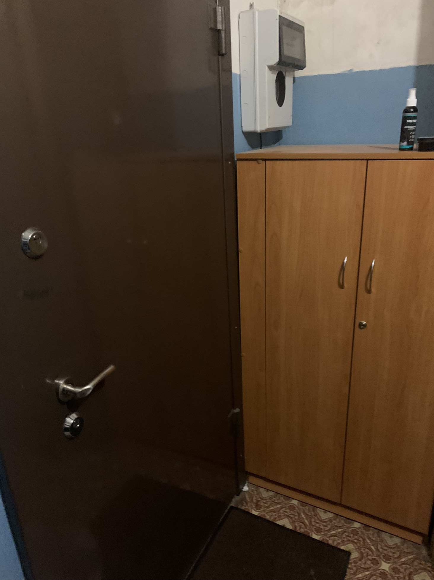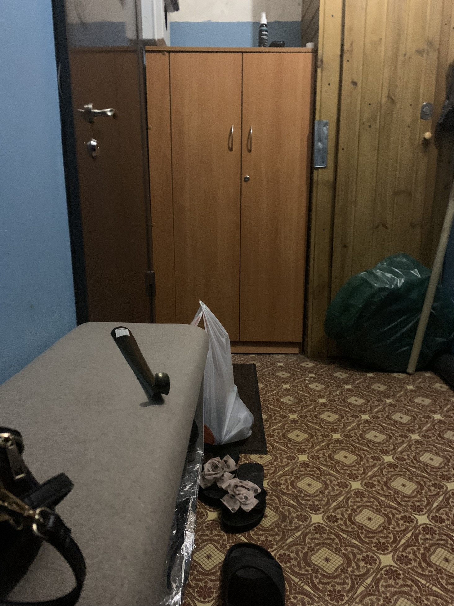 Тамбур на 2 квартиры, в тамубре размещена банкета и шкафчик для обуви.
