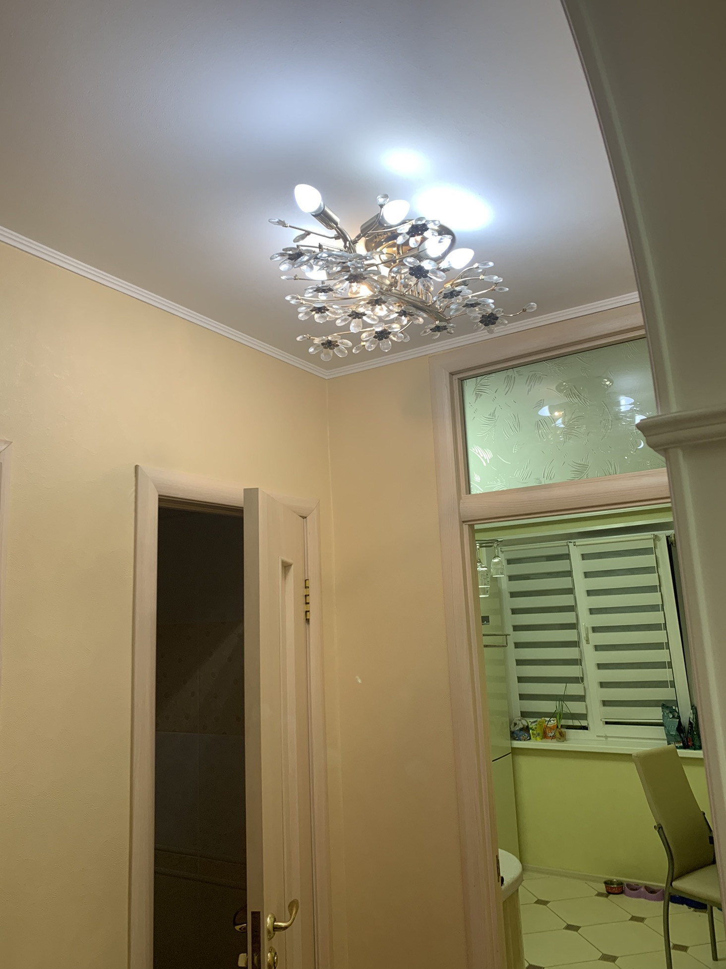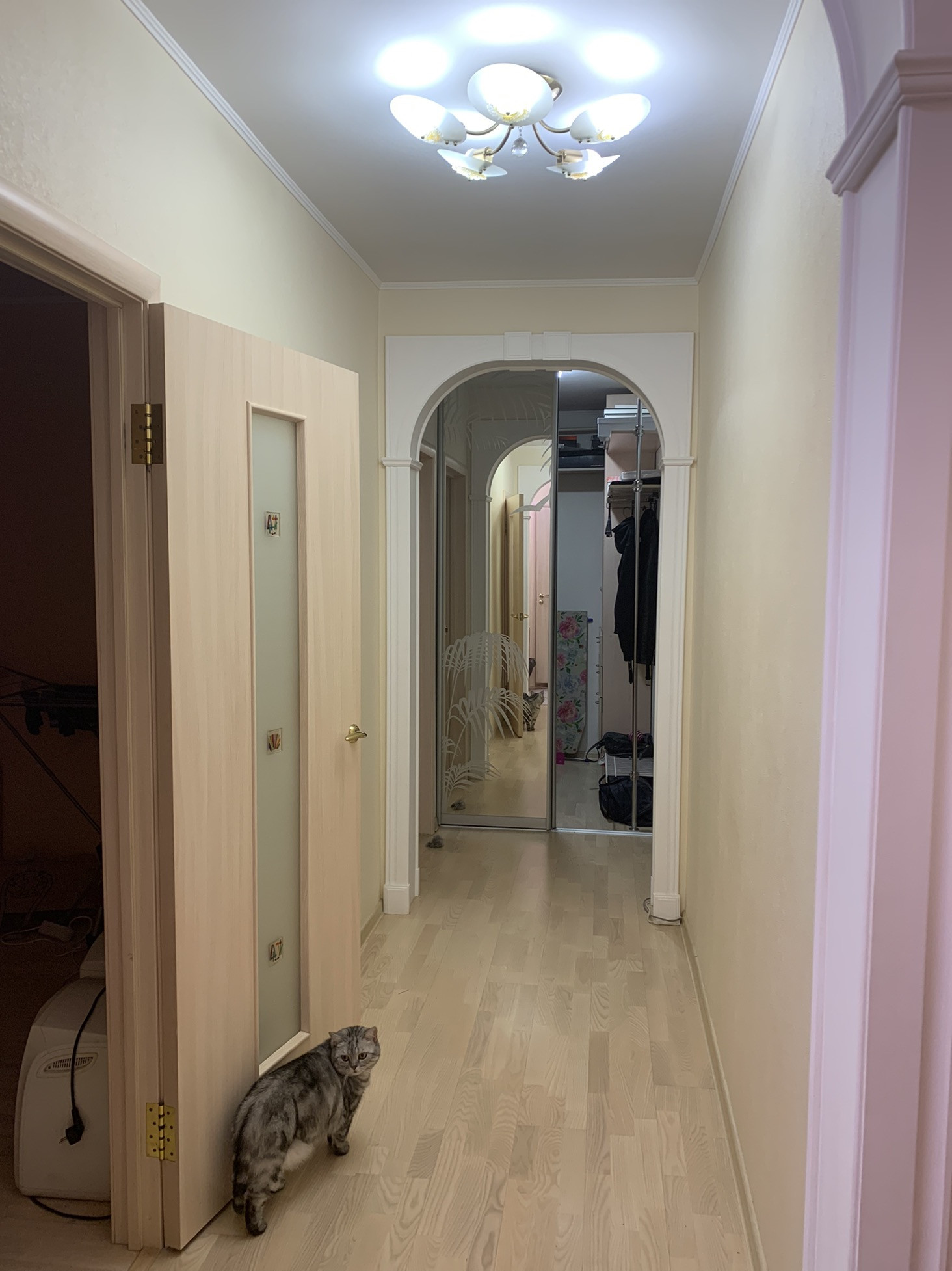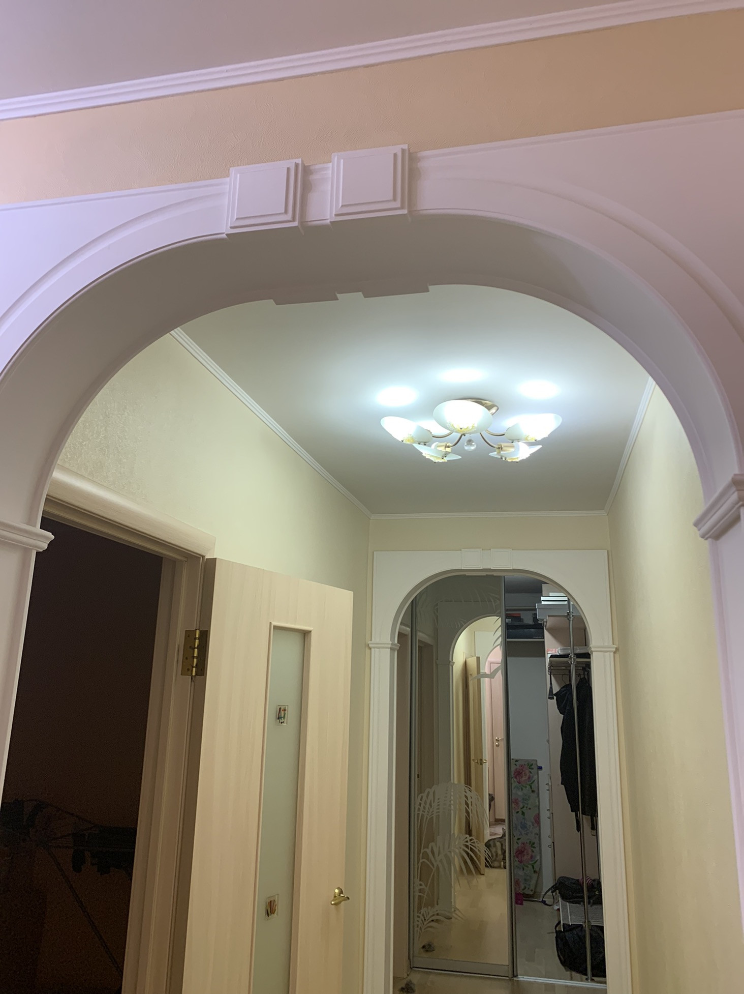 Арки в коридоре, также в коридоре сделана гардеробная с огромными зеркалами, во всех комнатах дорогие люстры и светильники -все остается новым хозяевам!