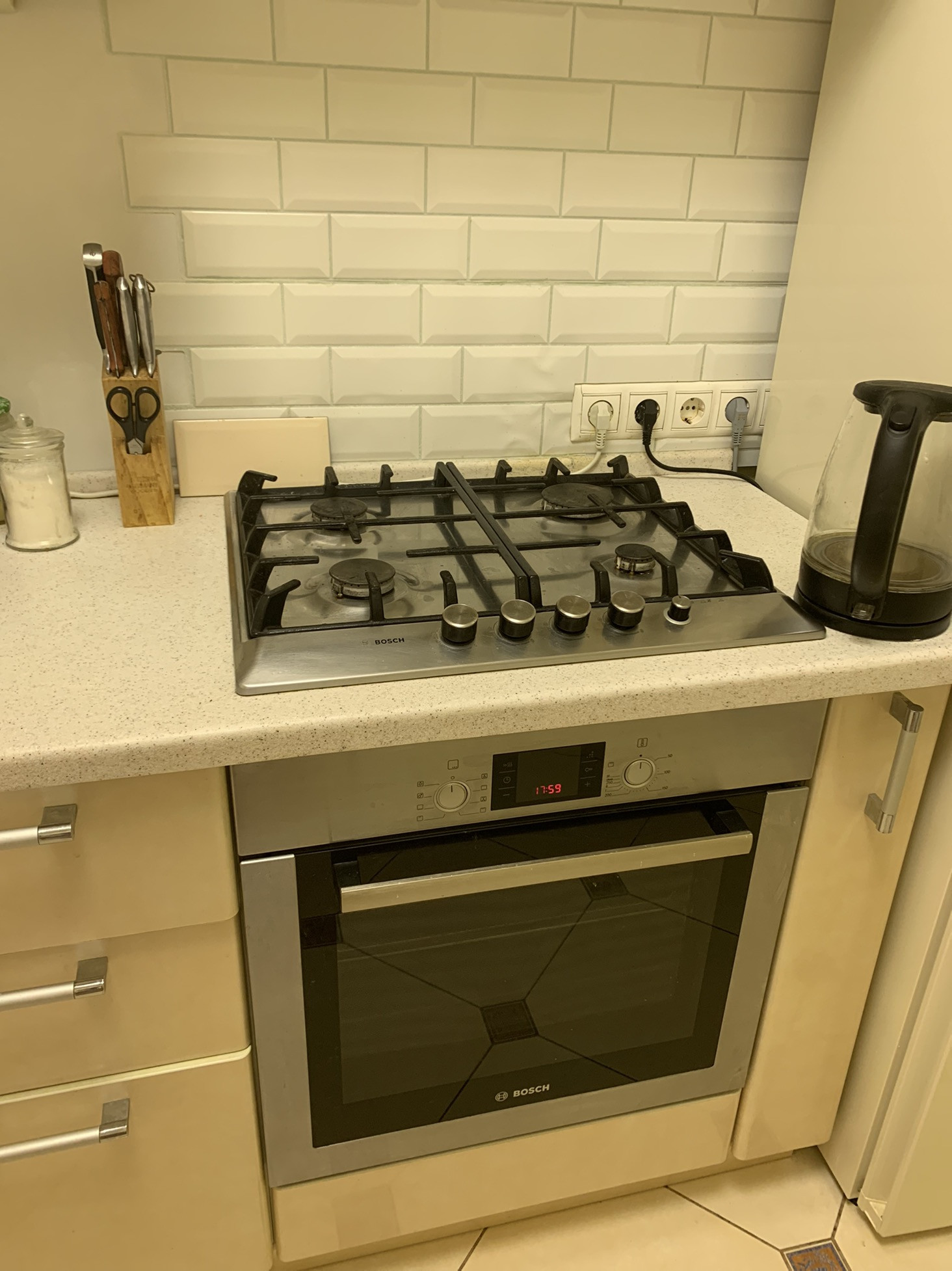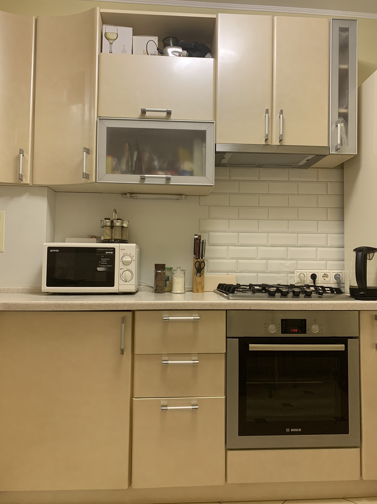 Кухня - остается кухонный гаритур со встроенной техникой (газовая панель, духовой шкаф, посудомоечная машина - все BOSH, стиральная машина), стол и стулья