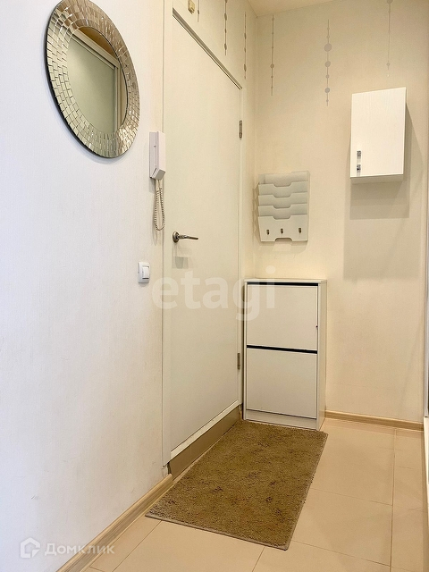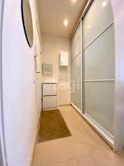 Новым владельцам остаётся кухонный гарнитур со встроенной стиральной машиной, гардеробный шкаф в прихожей, а также гарнитур в ванной.