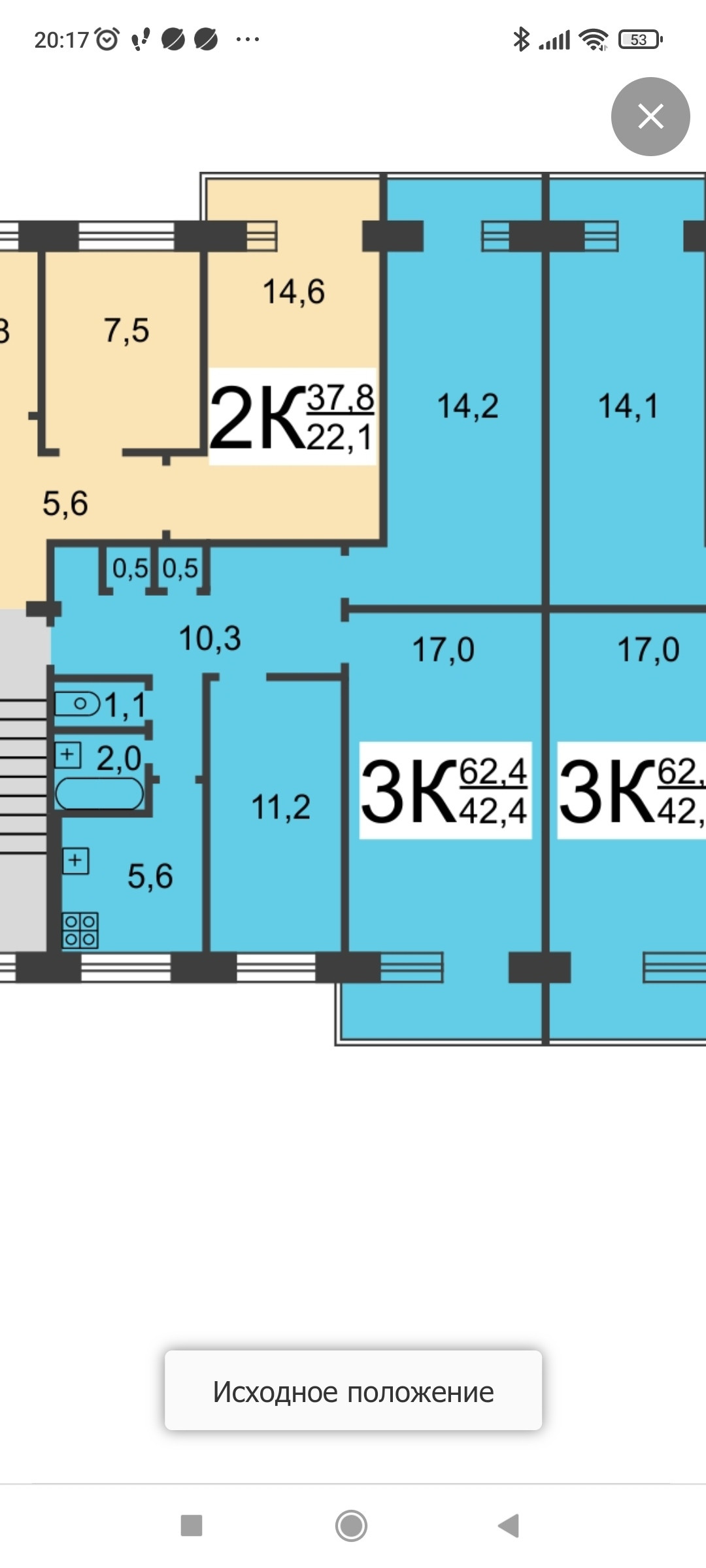 Жилая площадь 42.4 м2