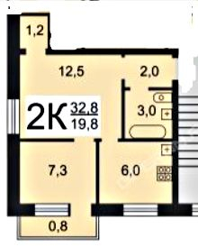 Квартира расположена на 4 этаже кирпичного дома. Общая площадь 32, 4 кв.м, жилая 20 кв.м.. Удобная планировка, комнаты на разные стороны 7, 5 и 12, 5 кв.м., кухня 6 кв.м., санузел совмещённый.