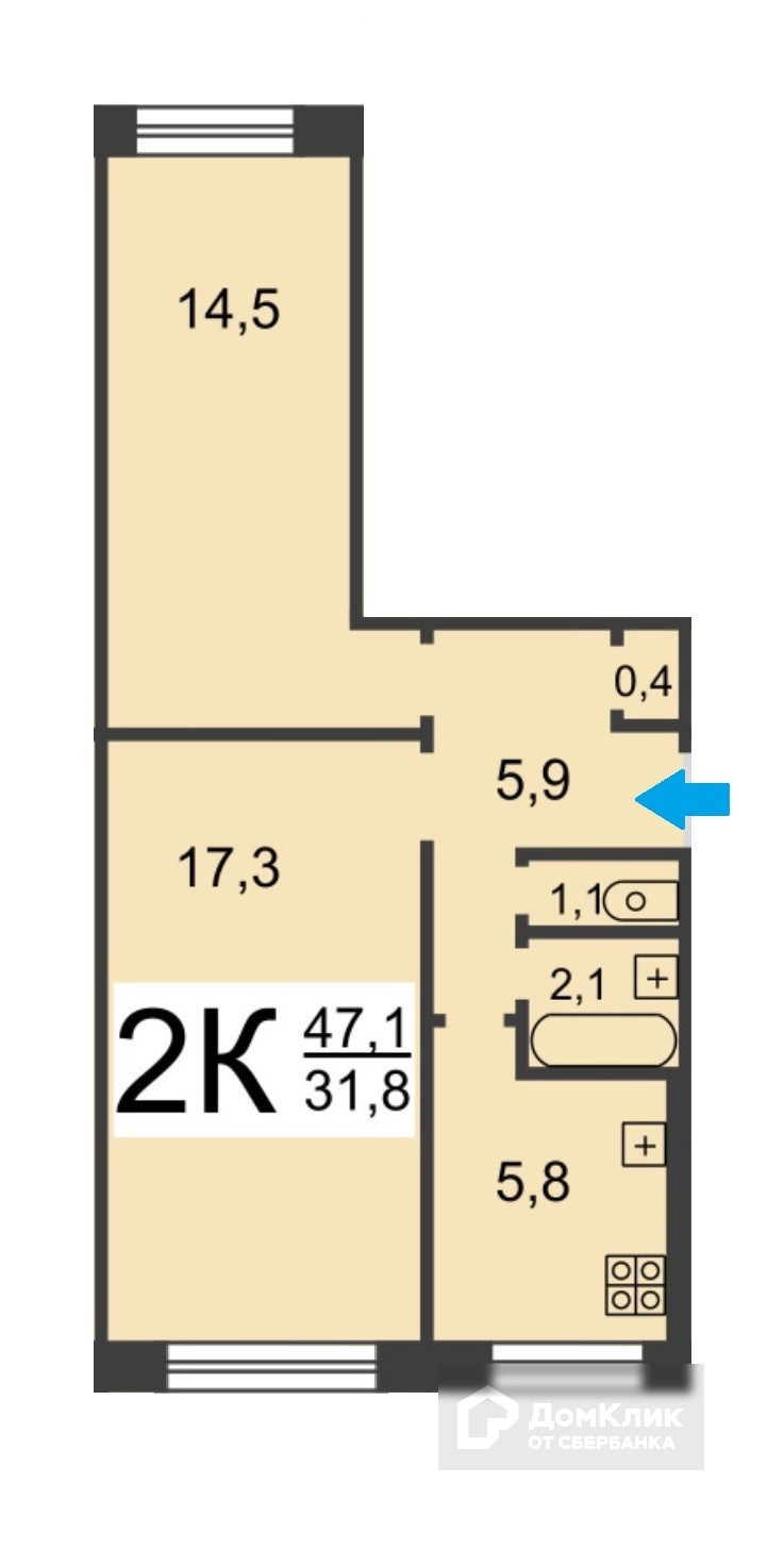 Жилая площадь 31.8 м2