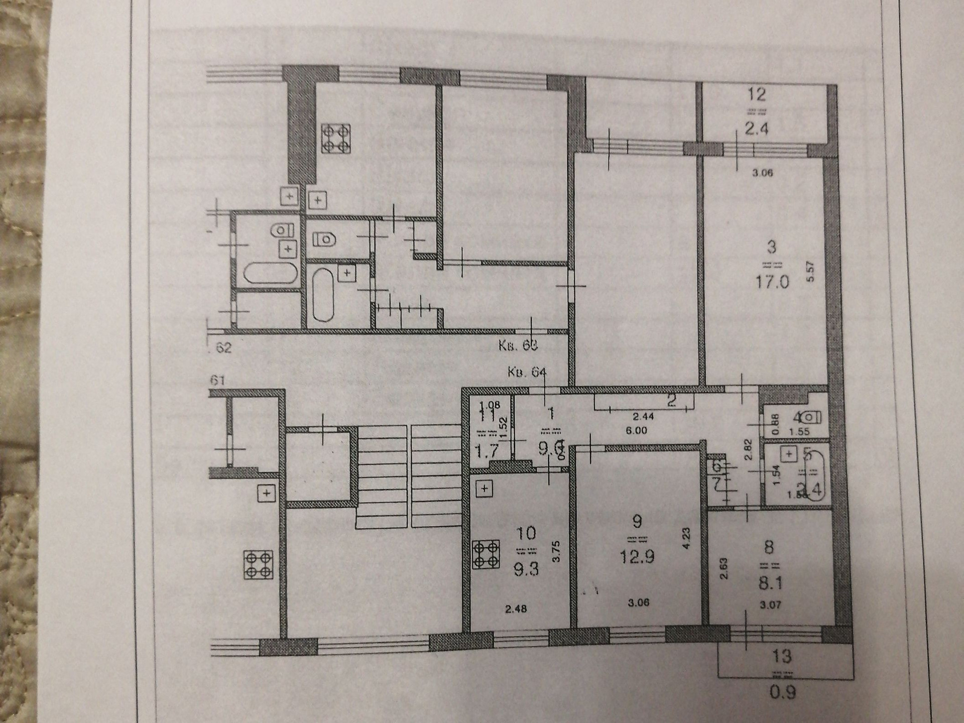 Продается отличная трехкомнатная квартира. Общая площадь 63.7 кв.м. (без учета балкона и лоджии). Жилая площадь 38 кв.м (комнаты 8, 1, 17, 12.9 кв.м), Кухня 9.3 кв.м. Санузел (1,55 и 2,4 м2) раздельный. В квартире заменены: окна и отопление, лоджия и балкон застекленные.