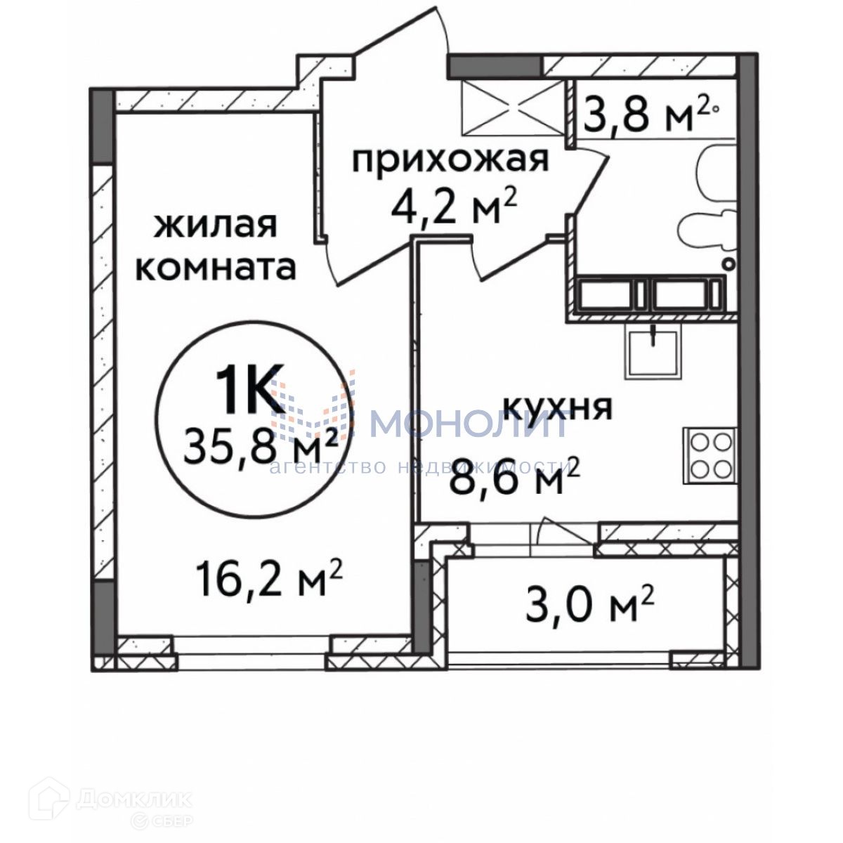 Общая площадь 35.8 м2