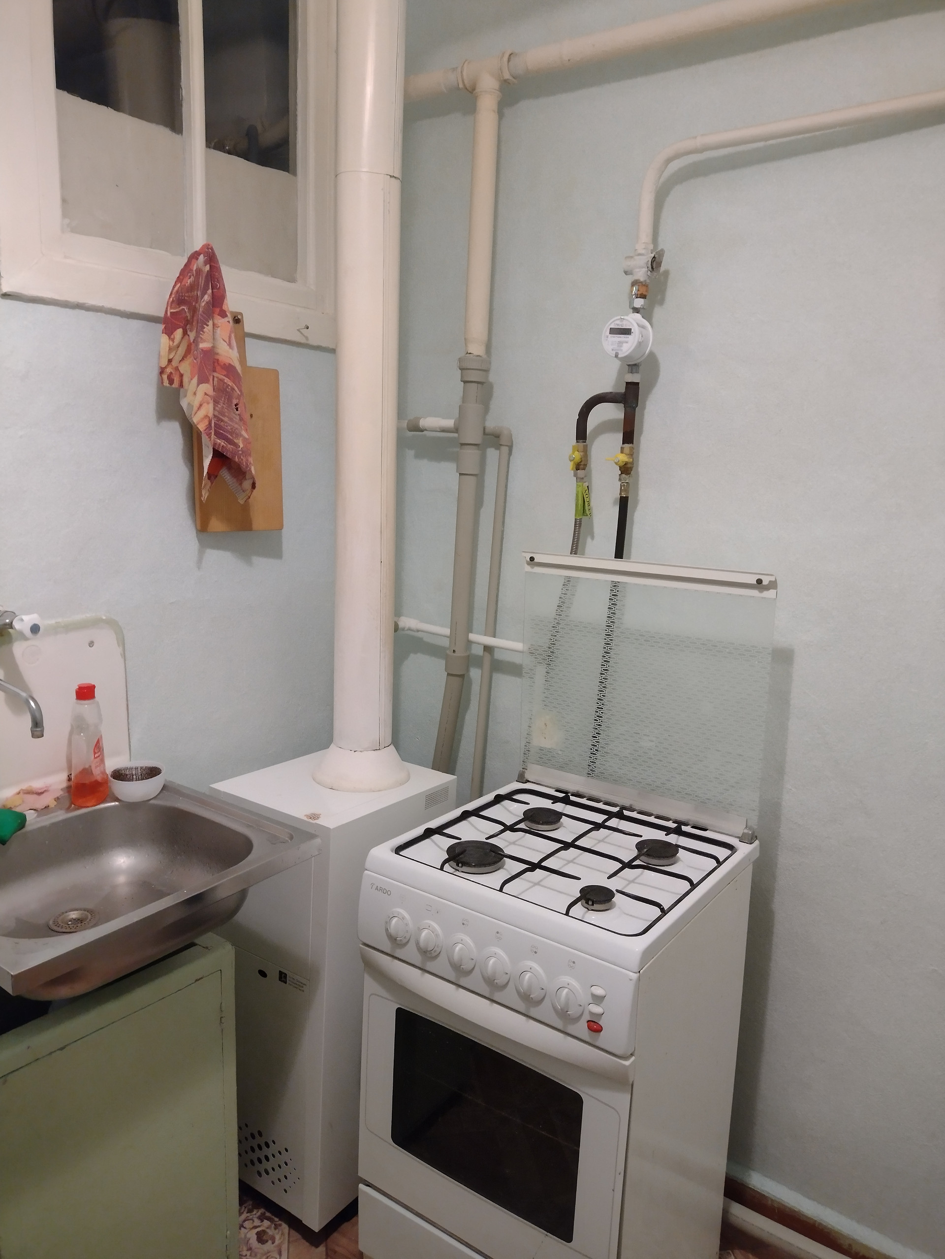 Новые: радиаторы отопления, газовый и водяной счётчики. Договор на обслуживание газового оборудования.