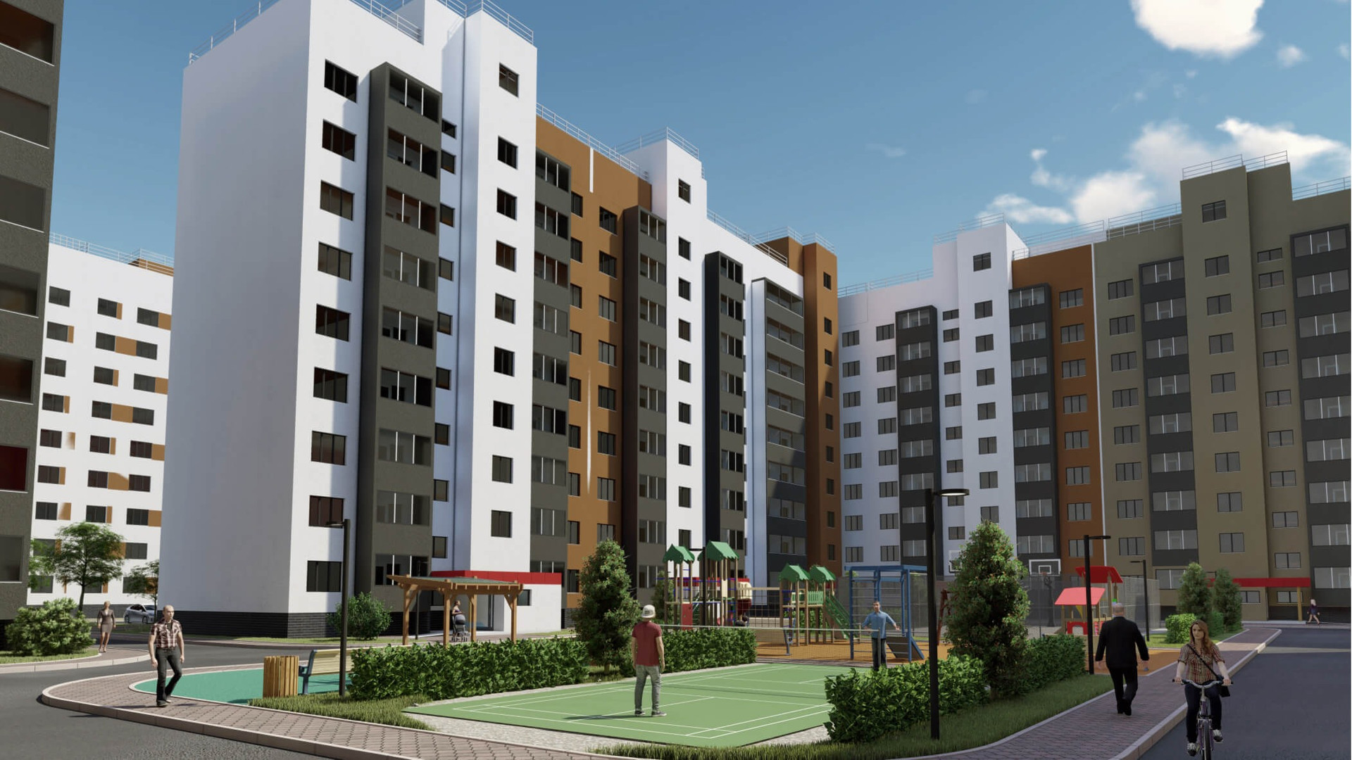 На территории жилого комплекса также предусмотрены детские площадки и места для отдыха взрослого населения.