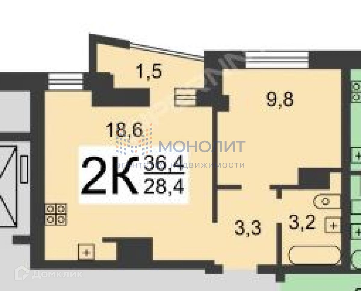 Общая площадь 36.4 м2