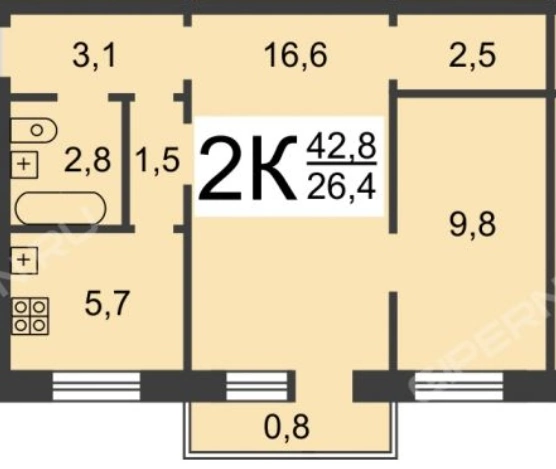 Жилая площадь 26.4 м2