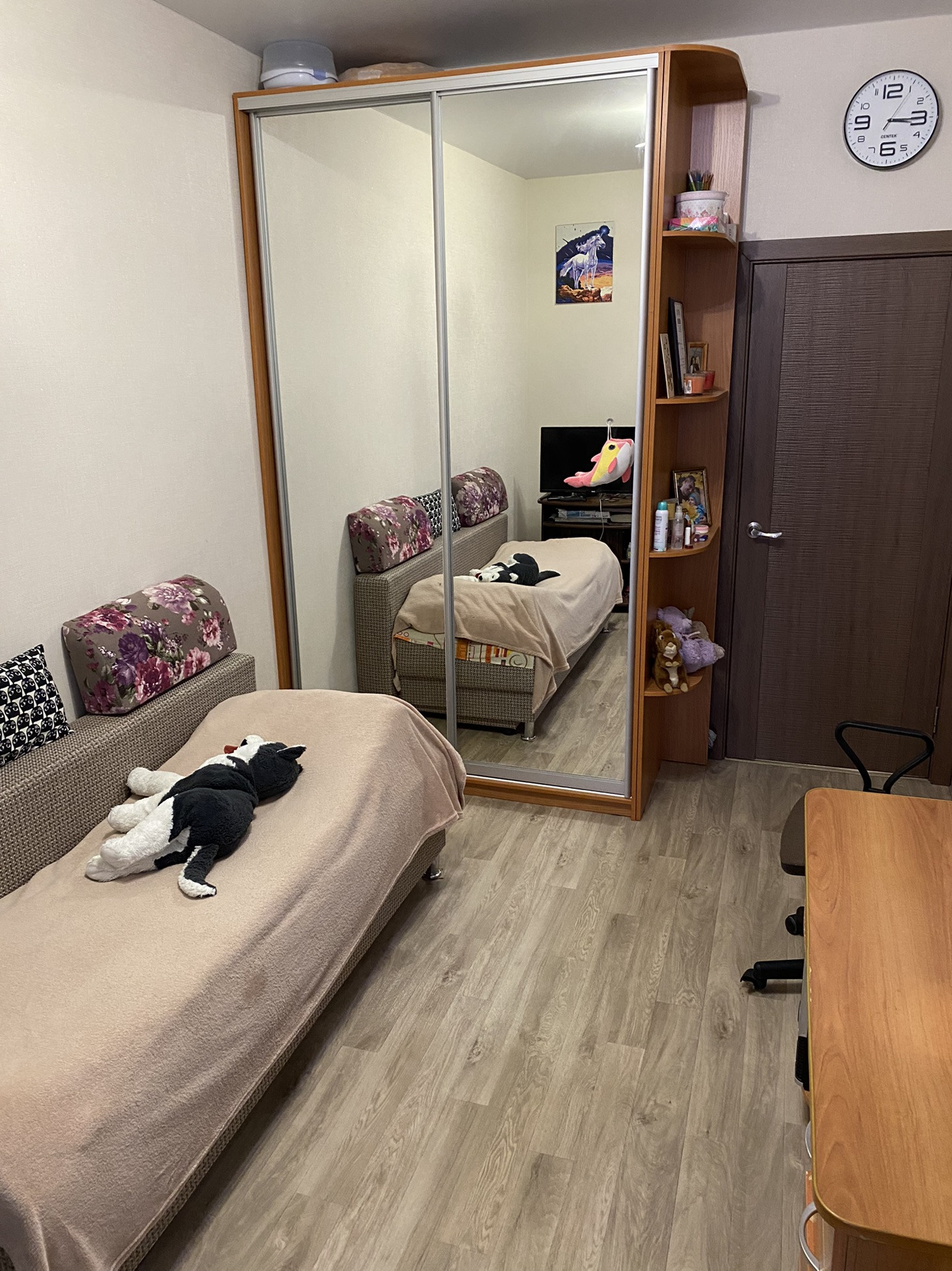Лоджия утеплённая, выведена батарея, свет и установлен шкаф с замком, паркет