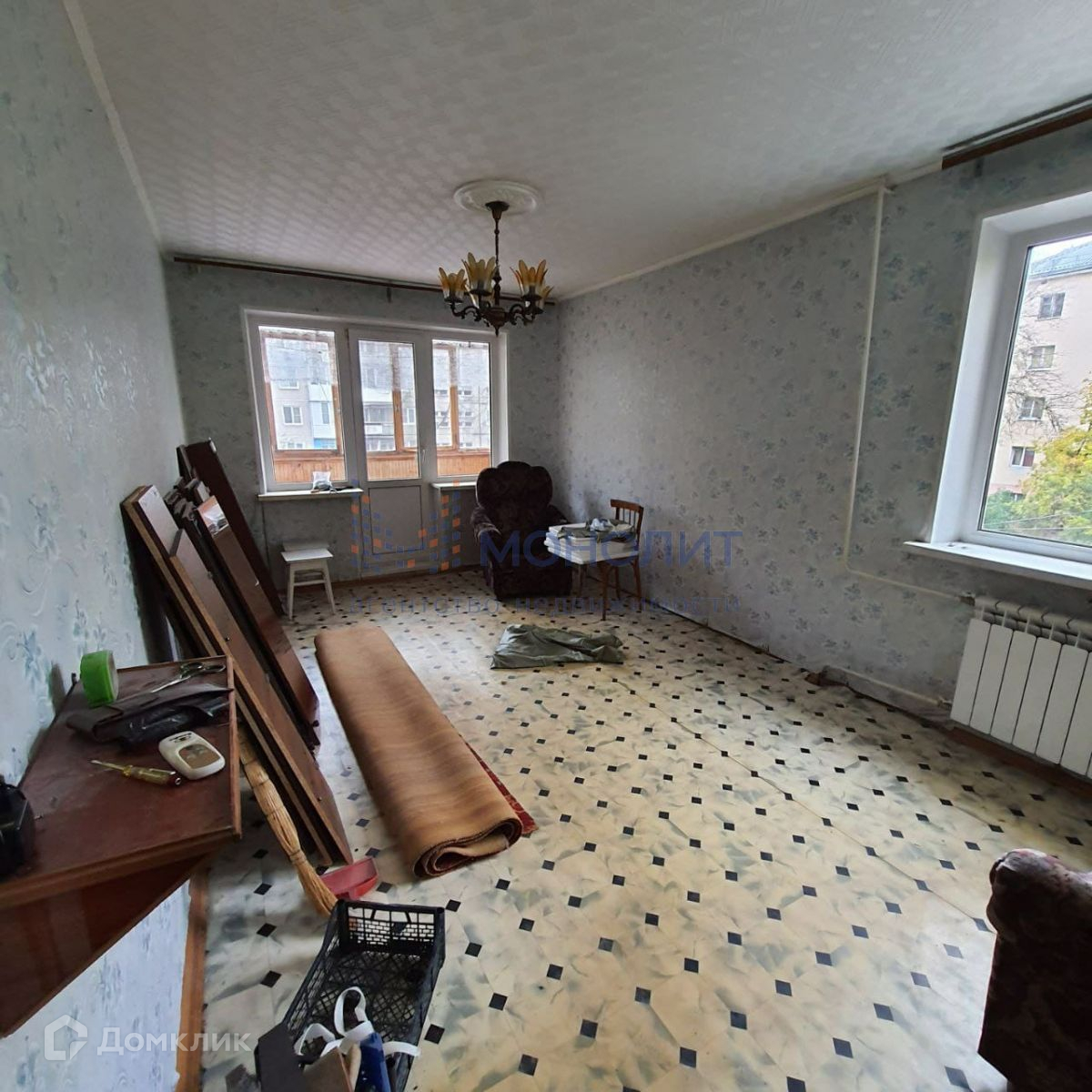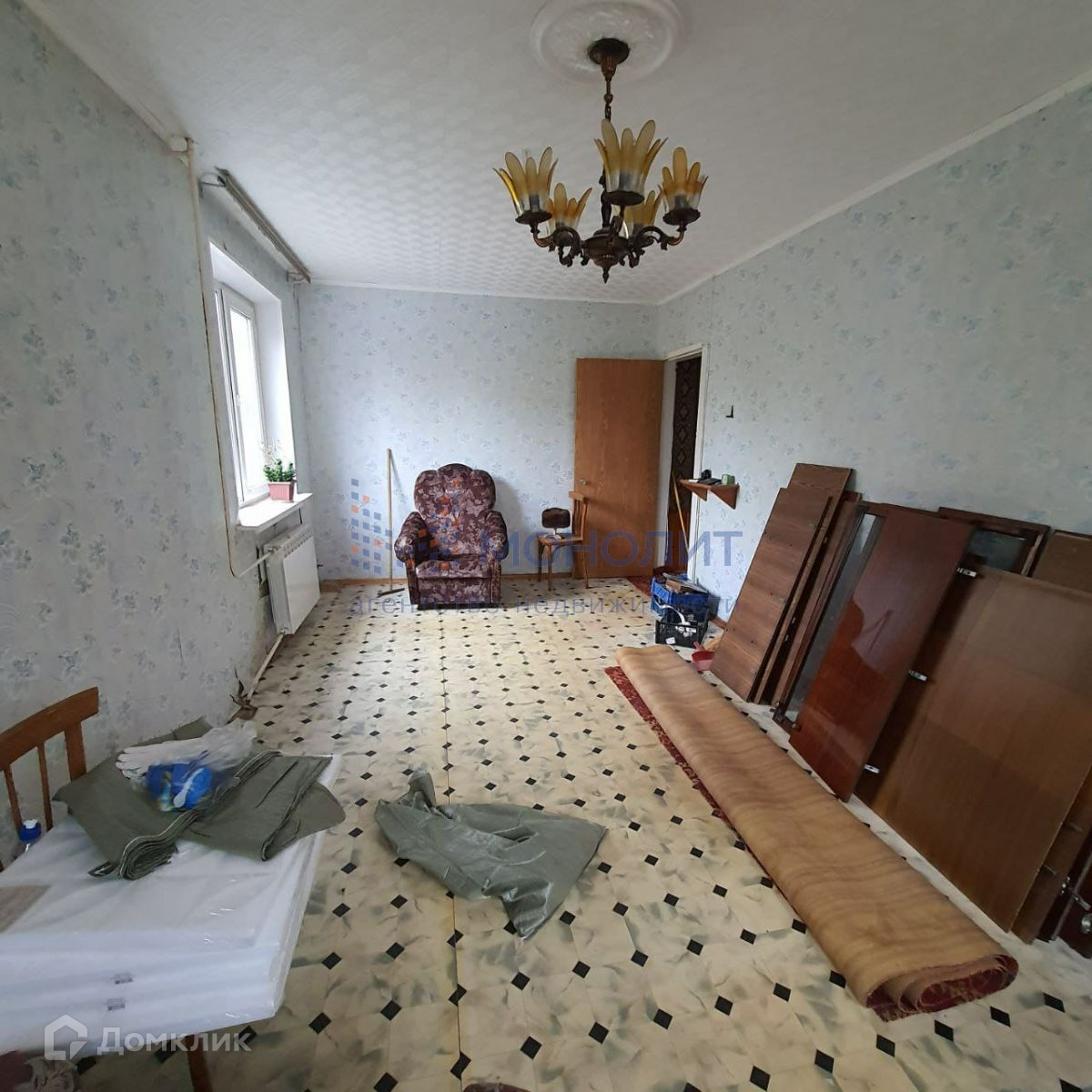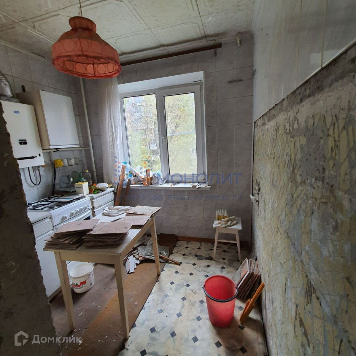 Квартира под ремонт. Плитку в кухне сняли, чтоб обновить. В ванной и туалете плитка тоже обновляется. Окна пластиковые.
