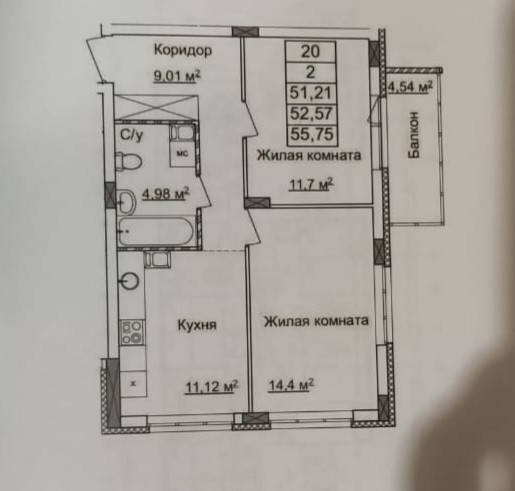 Общая площадь 52 м2