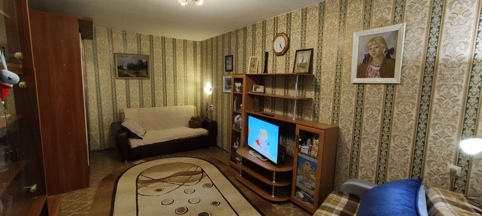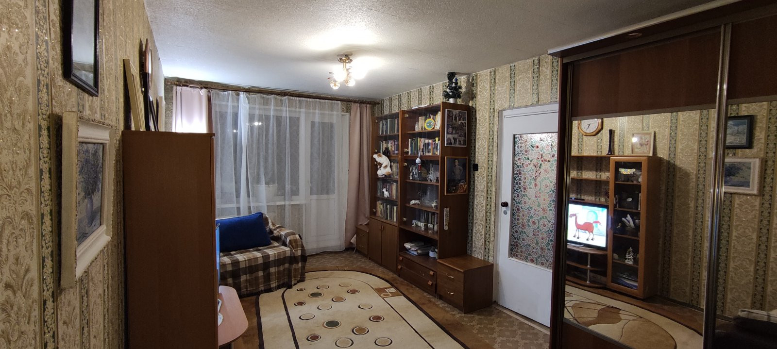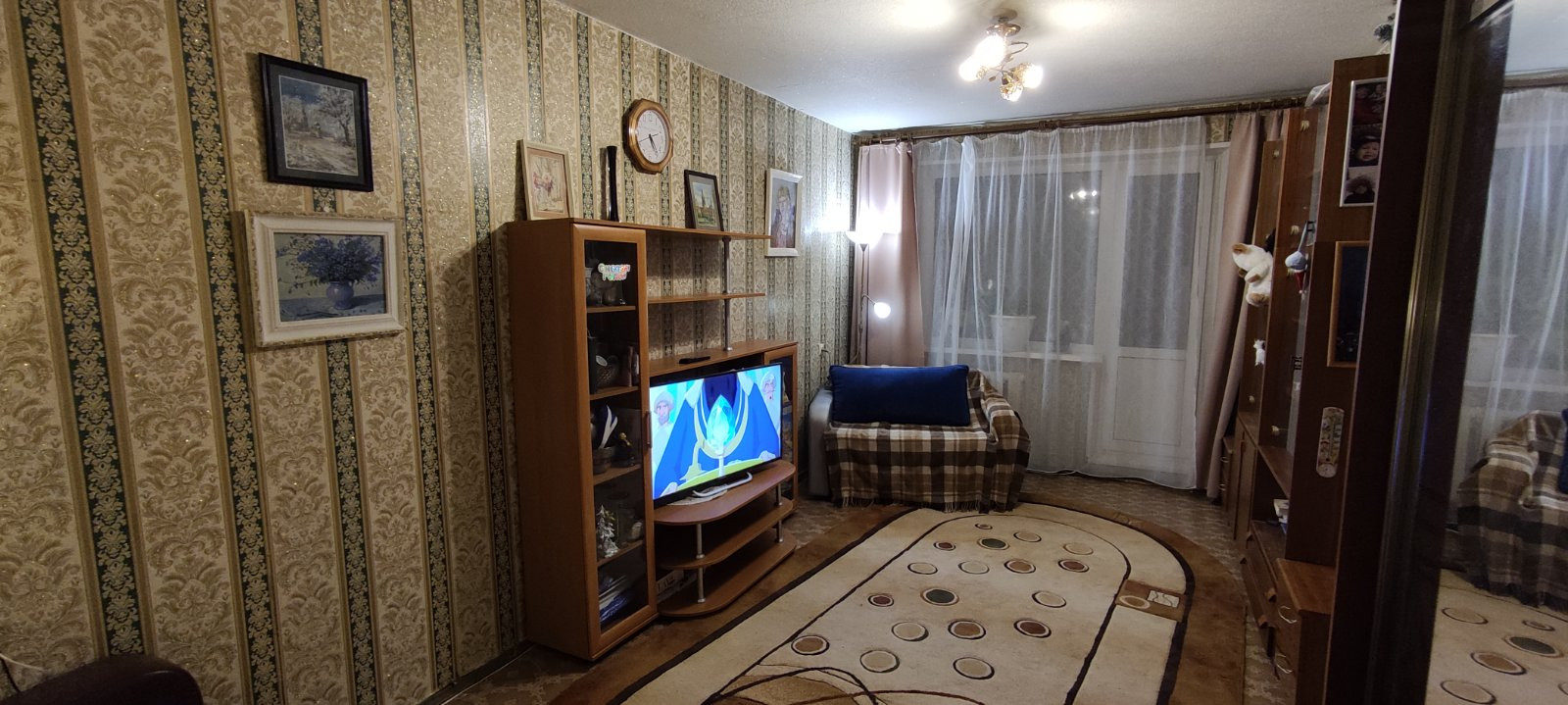 Комната -17,5 кв. м/кухня- 8,3 . лоджия -1,9 кв м застеклена , с встроенным ящиками,обшита деревом,  в прихожей имеется кладовка-гардеробная с полками, санузел в современной плитке совмещенный, ванны-нет, сливное душевое место современное.