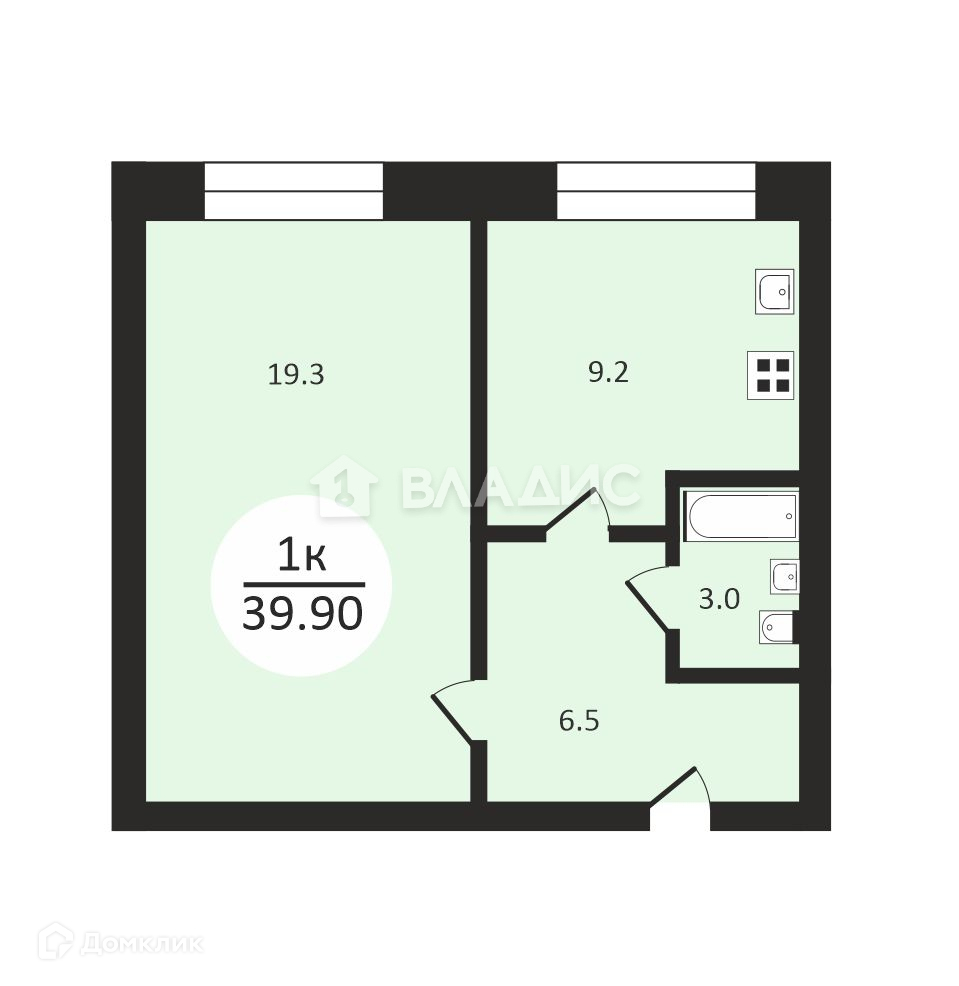 Общая площадь 39.5 м2