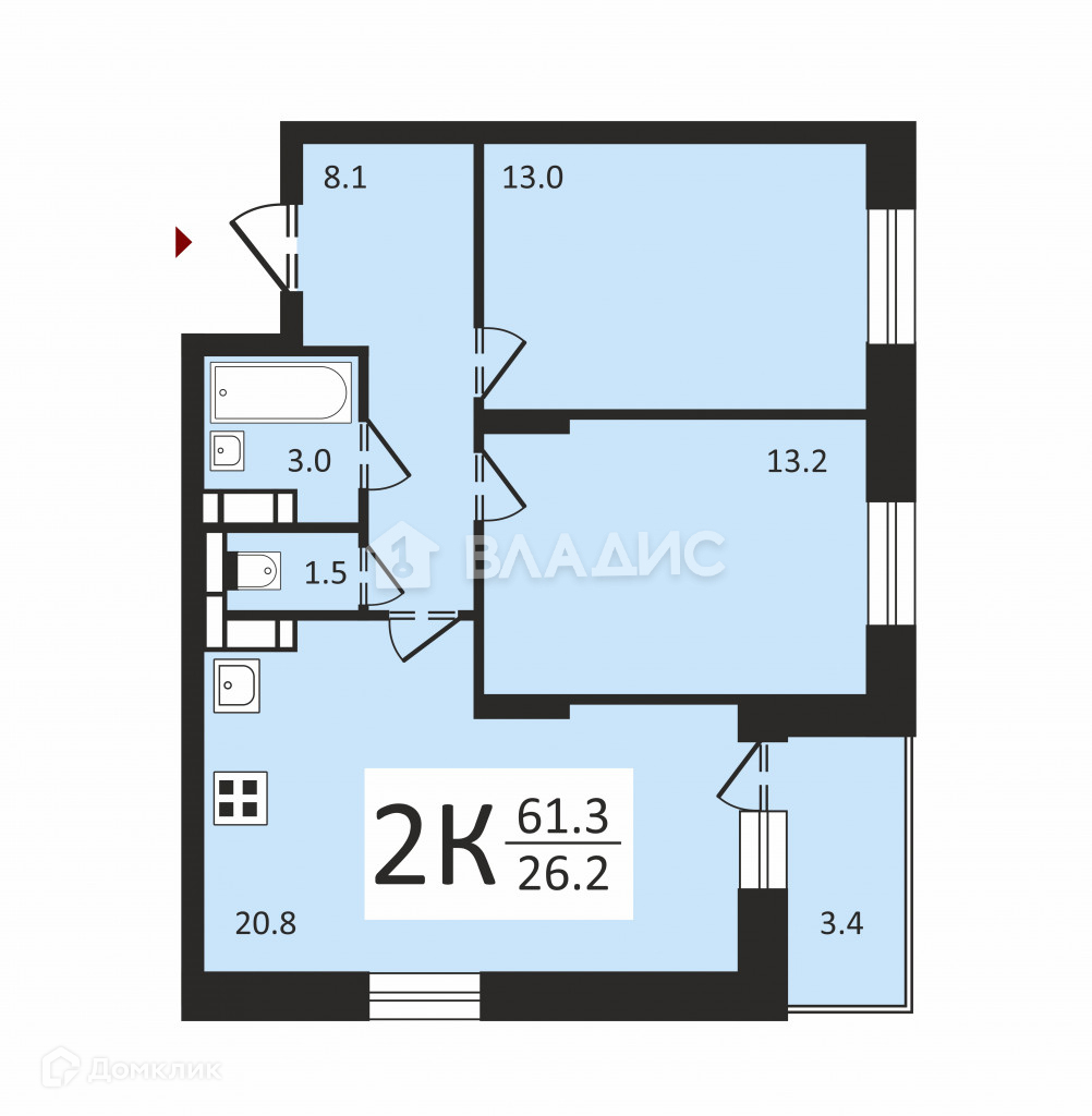 Общая площадь 61.3 м2