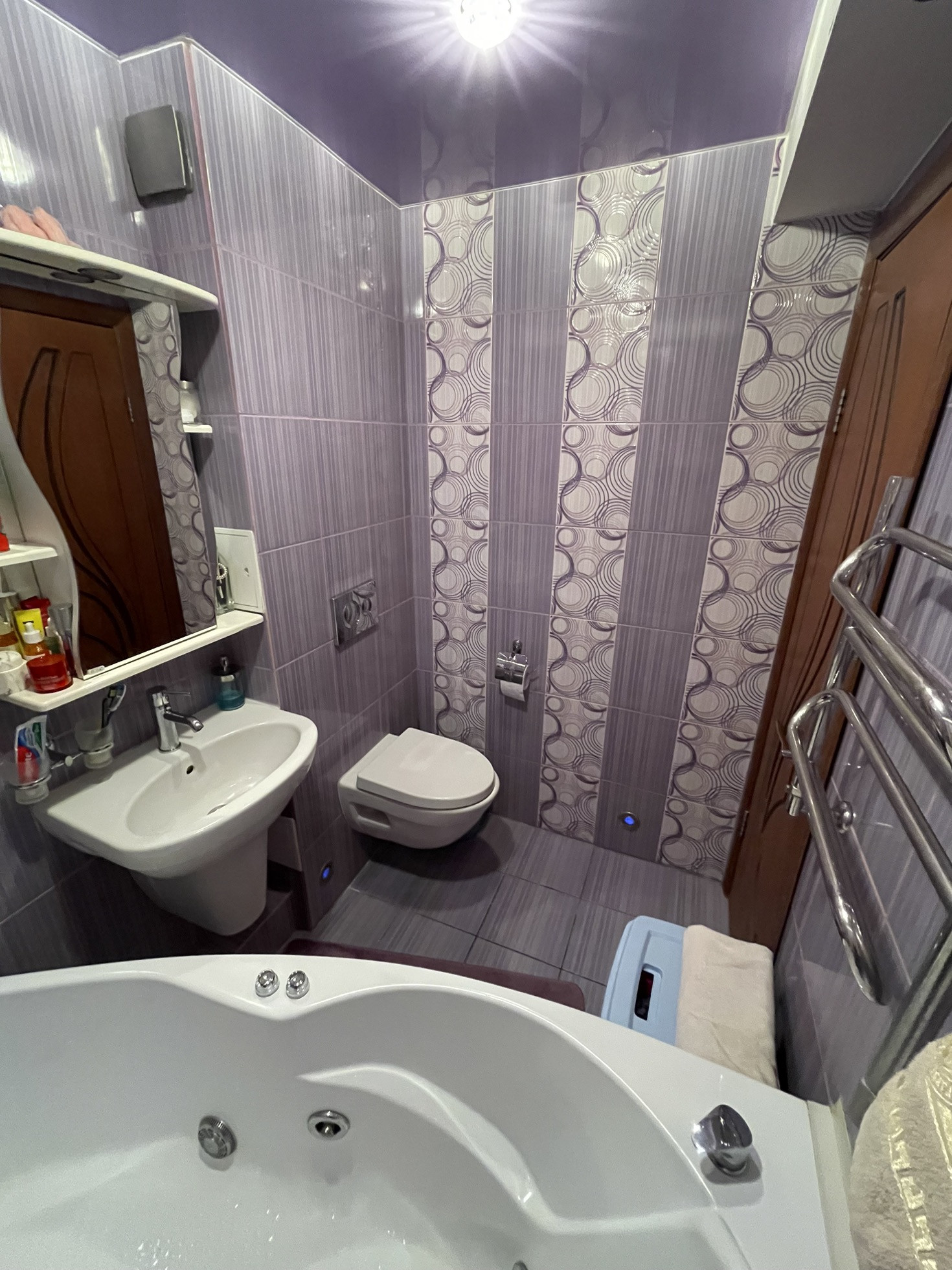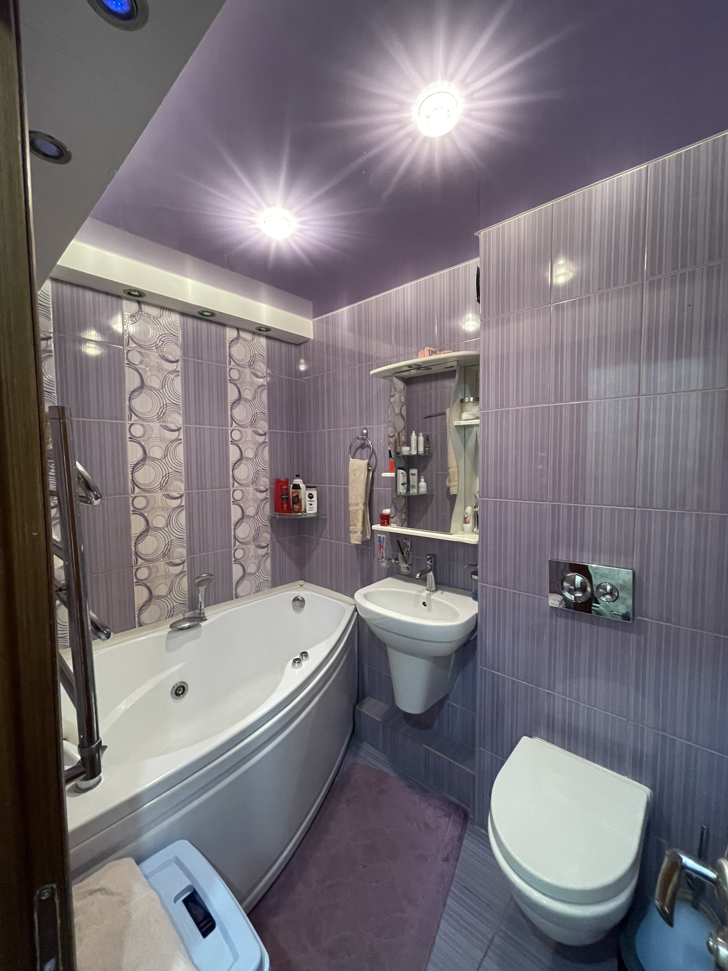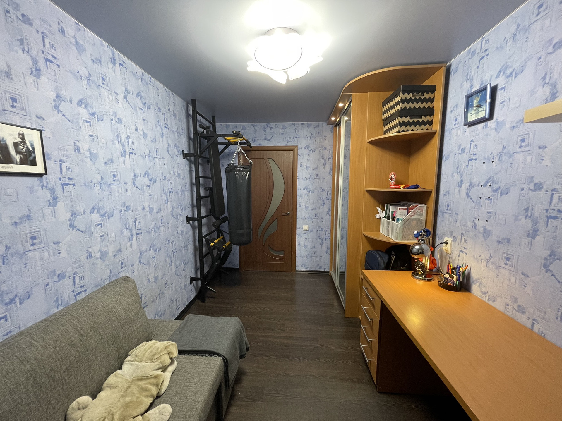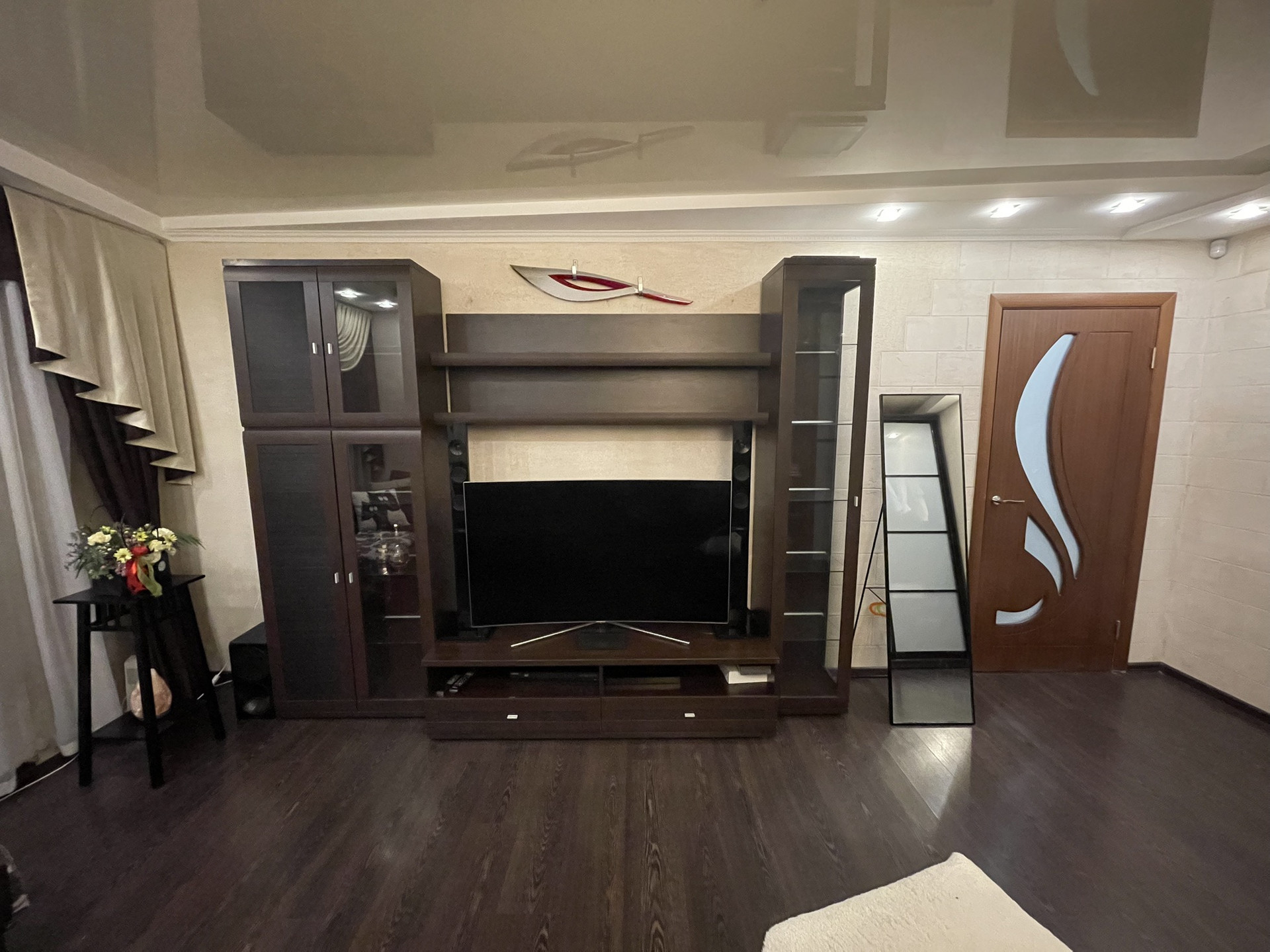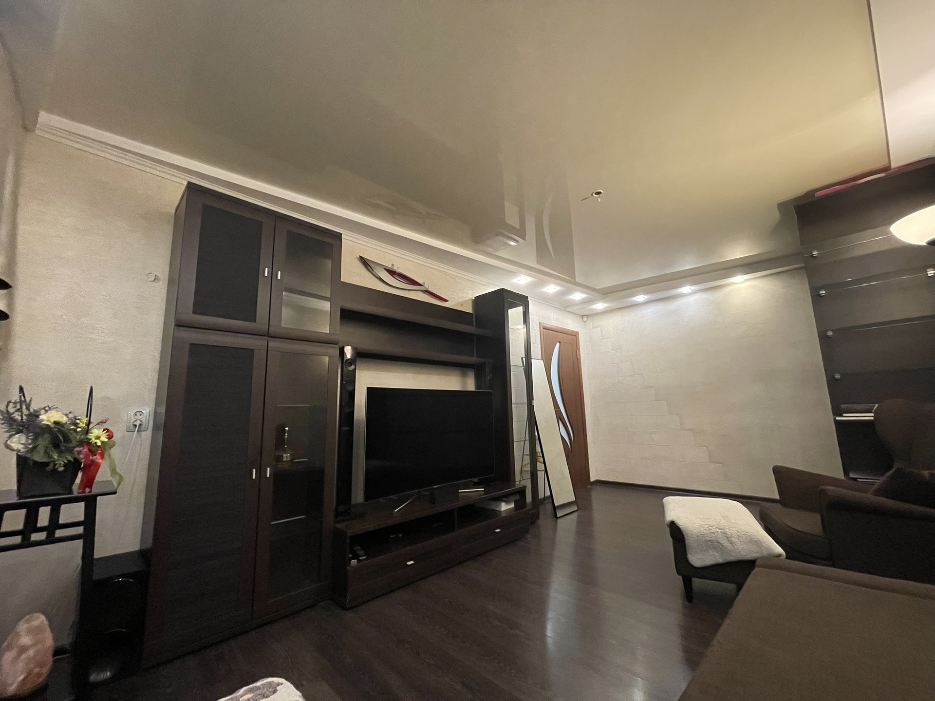 В квартире: пластиковые окна и застекленный витражный пластиковый балкон; покрытие пола - ламинат, покрытие потолка - натяжные потолки. Ванная комната - полностью плитка, теплый пол, гидромассажная ванная. В комнате установлен турник (возможно оставить по согласованию). Кухня - кухонный гарнитур с максимальным использованием пространства, встроенный холодильник, вытяжка, жарочная панель - остаются.
