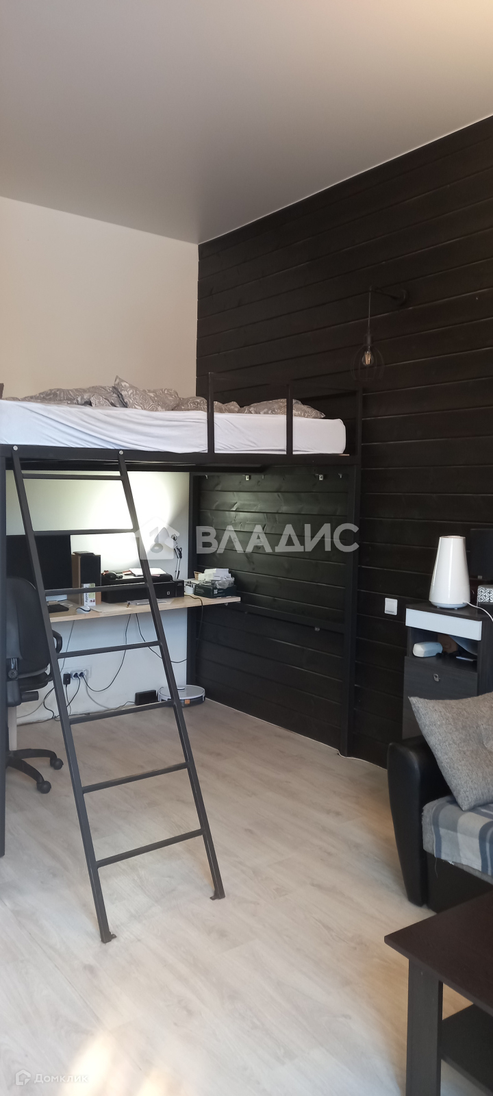 Двухуровневая двуспальная кровать выполнена на заказ, под ней место для "рабочего кабинета".