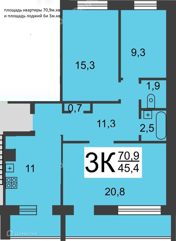 Общая площадь 70.9 м2