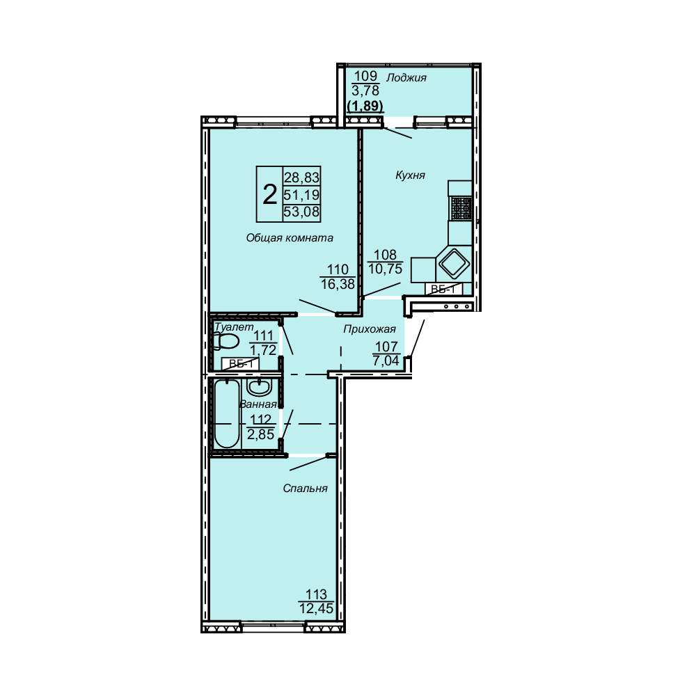 Общая площадь 54.97 м2