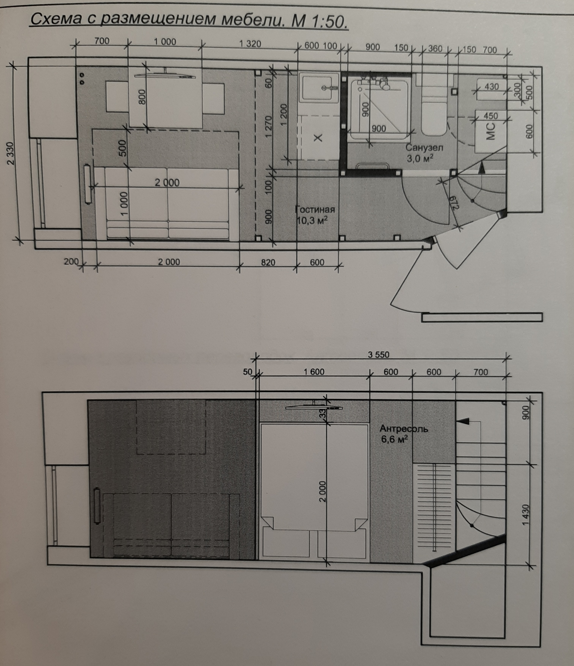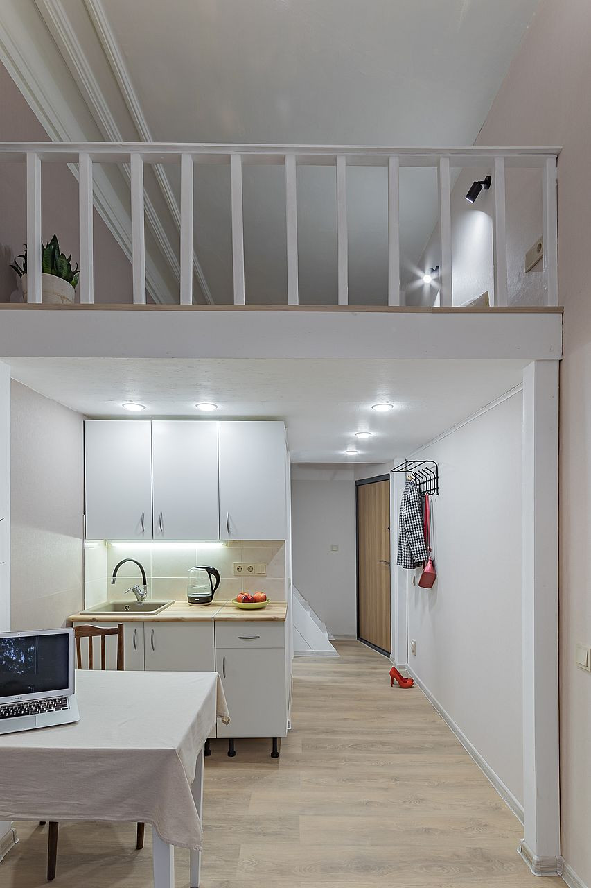 Общая площадь квартиры 20,5 кв. метров, площадь первого этажа 14 кв. метров, второго — 6,5 кв. метров. Высота потолка первого этажа 3,7 м., санузла и коридора 2 метра, второго этажа 1,5 метра.