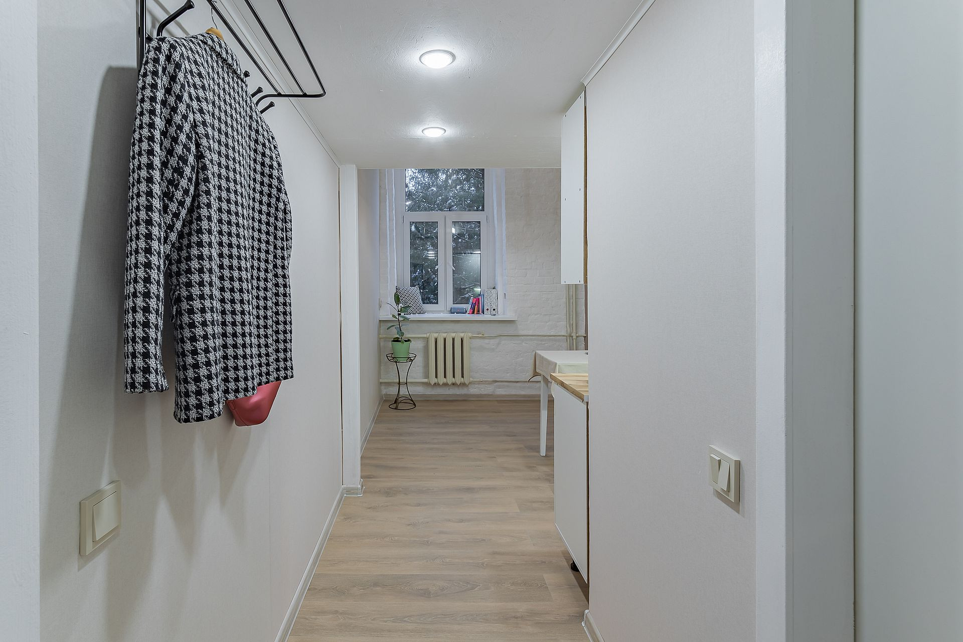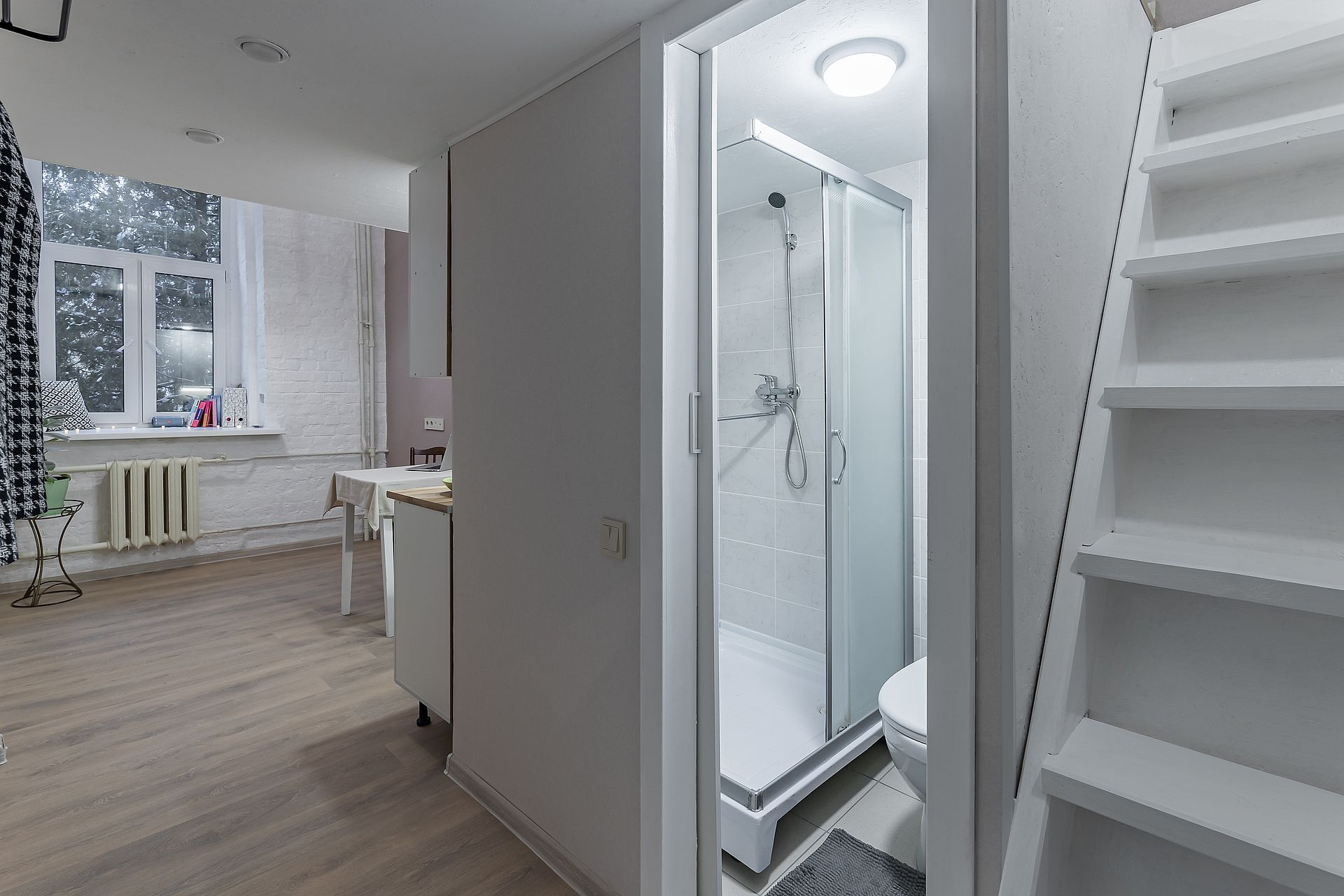 Установлено дорогое пластиковое окно с тремя вариантами открывания на обе створки, выровнены стены и пол, выполнена круговая шумоизоляция. Установлен кухонный гарнитур с раковиной. Утепленная металлическая входная дверь с шумоизоляцией и защитой от сквозняков.