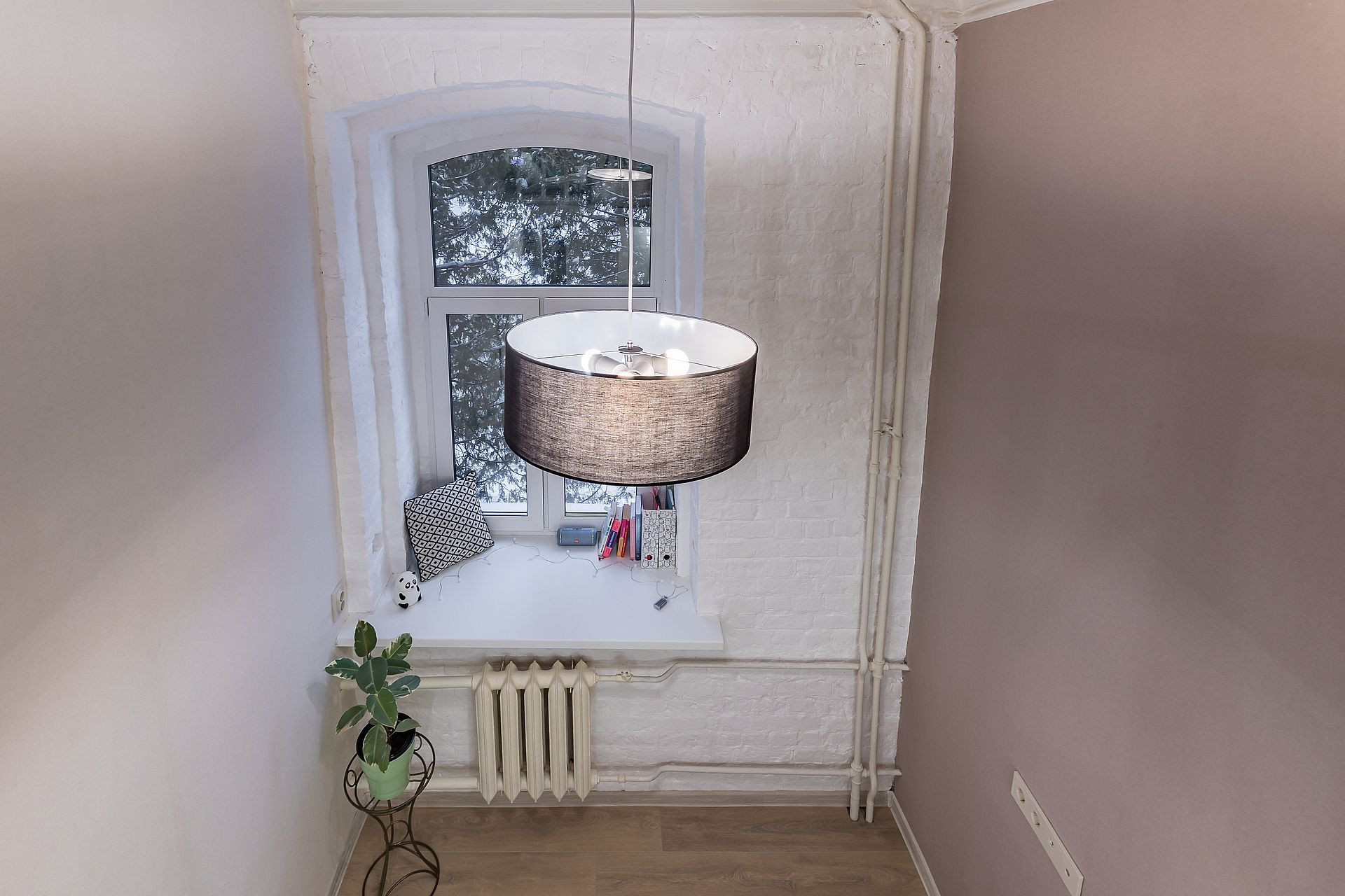 Окно выходит на ТЦ «Океанис», перед окном растут ели, есть ощущение леса,