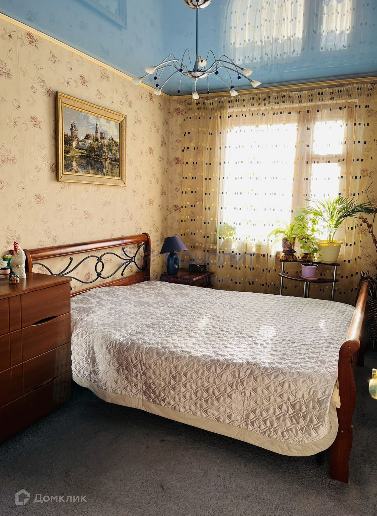 Натяжные потолки во всей квартире, пластиковый стеклопакет в зале, на кухне и в спальне установлены деревянные окна.