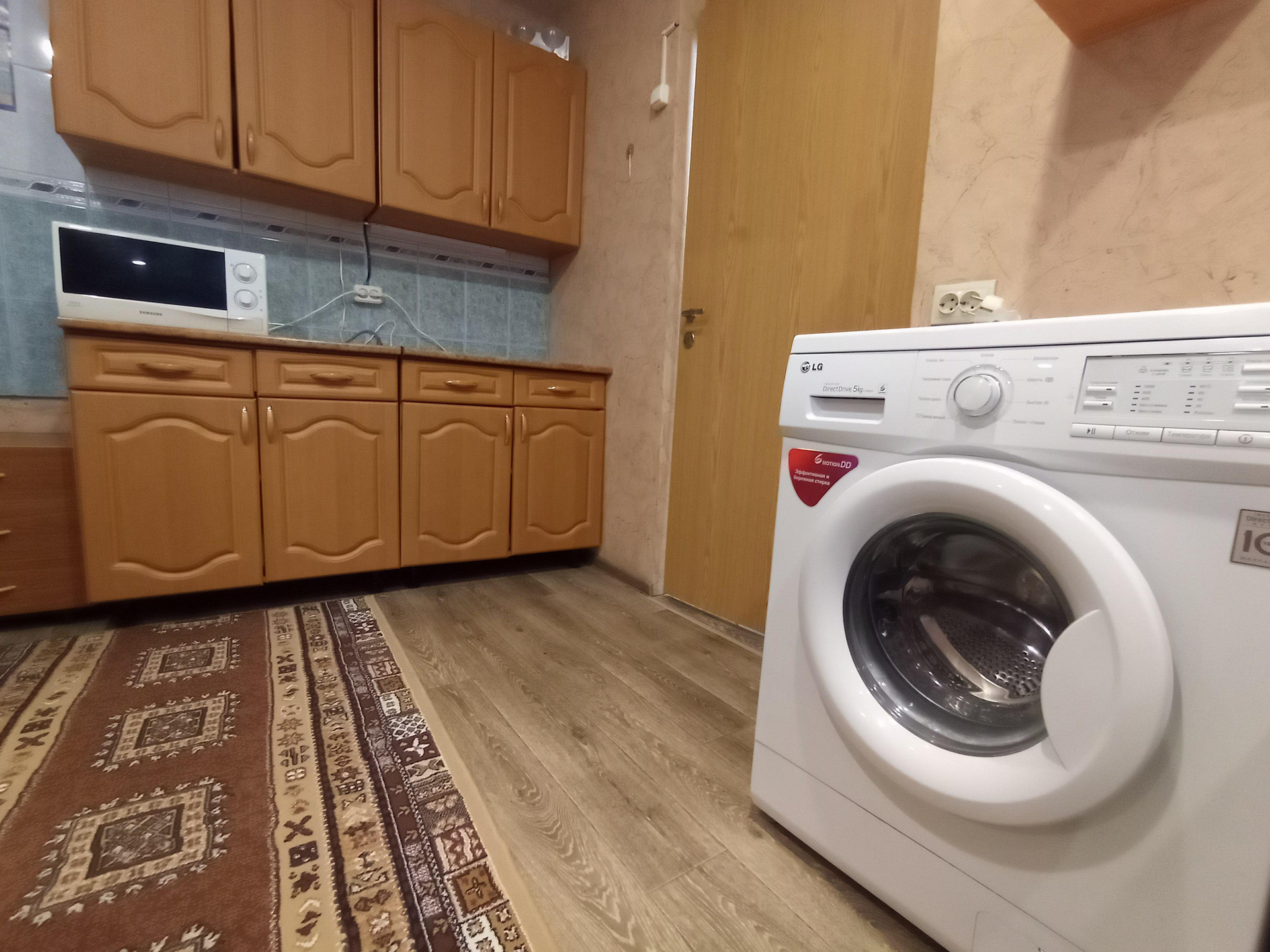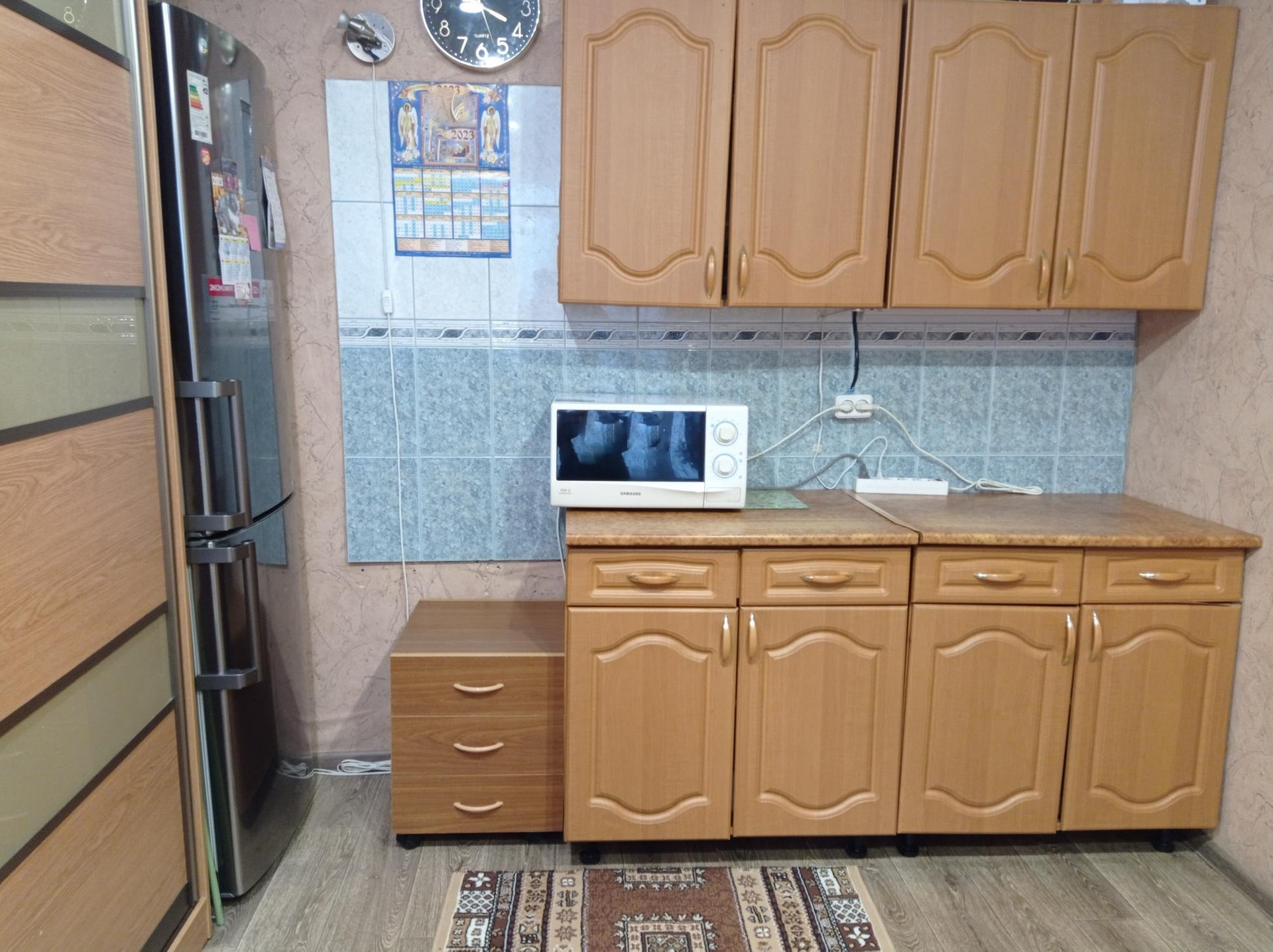 В квартире сделан косметический ремонт : потолки- натяжные, напольное покрытие :линолеум, керамическая плитка, заменена электропроводка и установлено пластиковое окно .