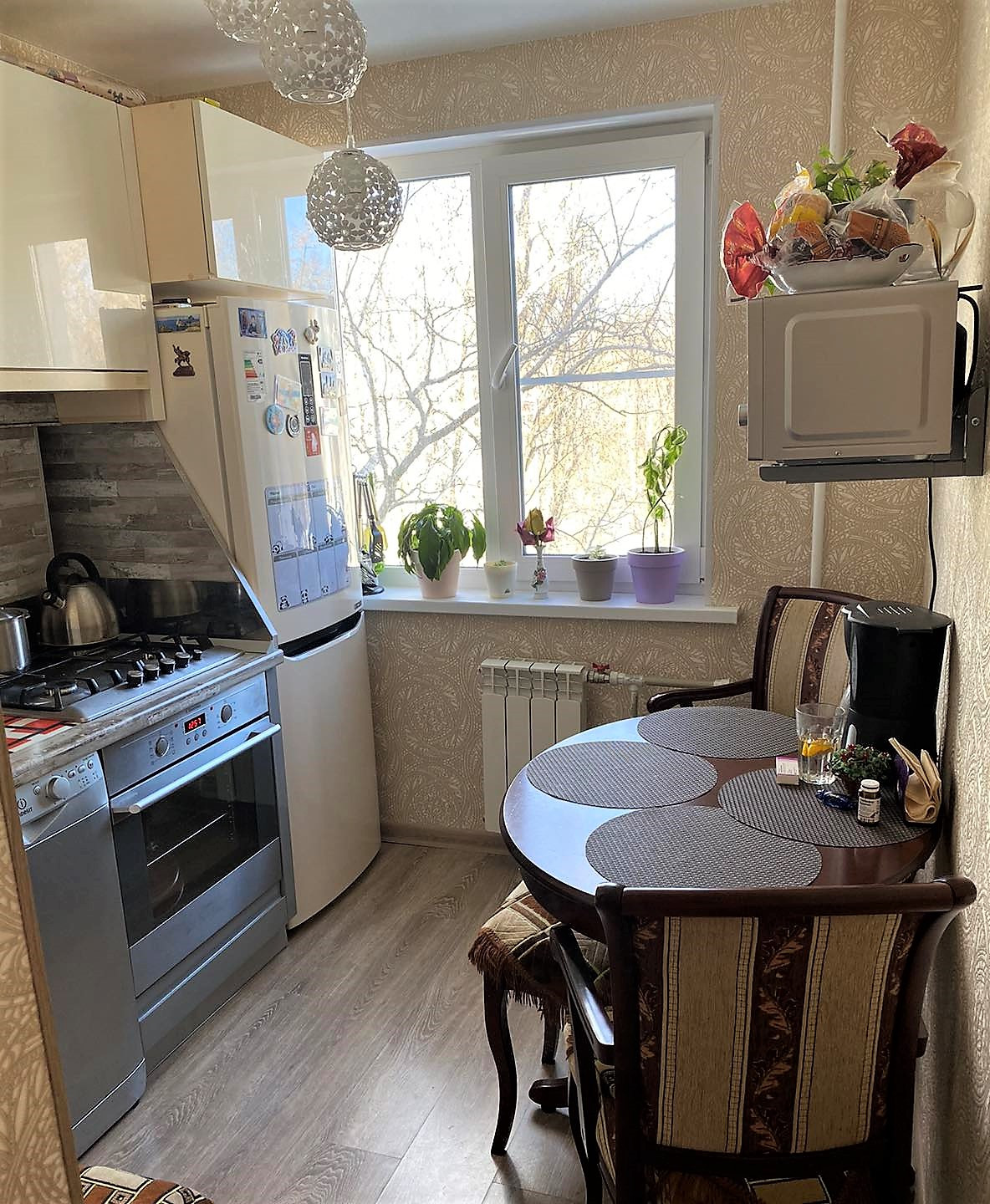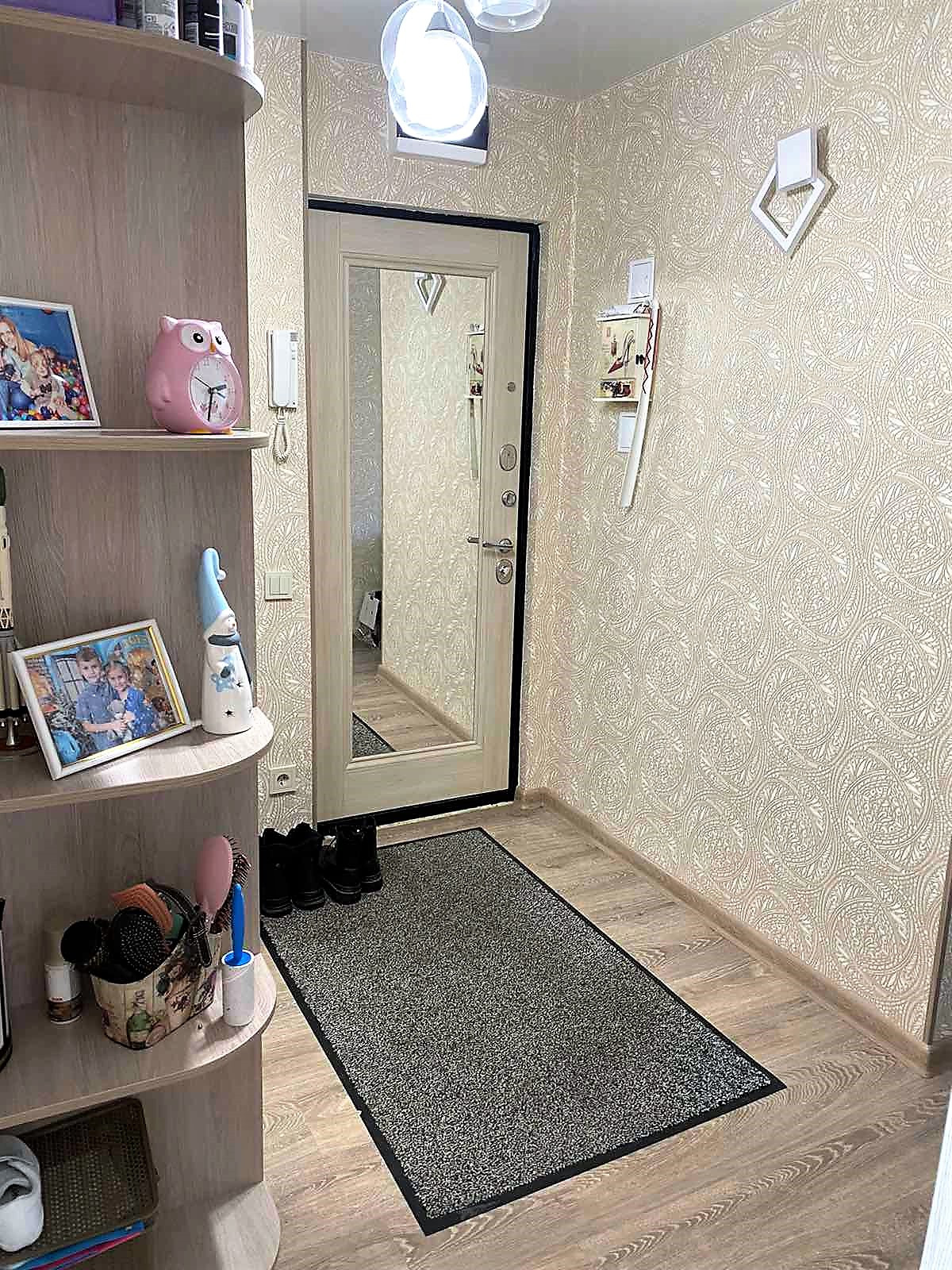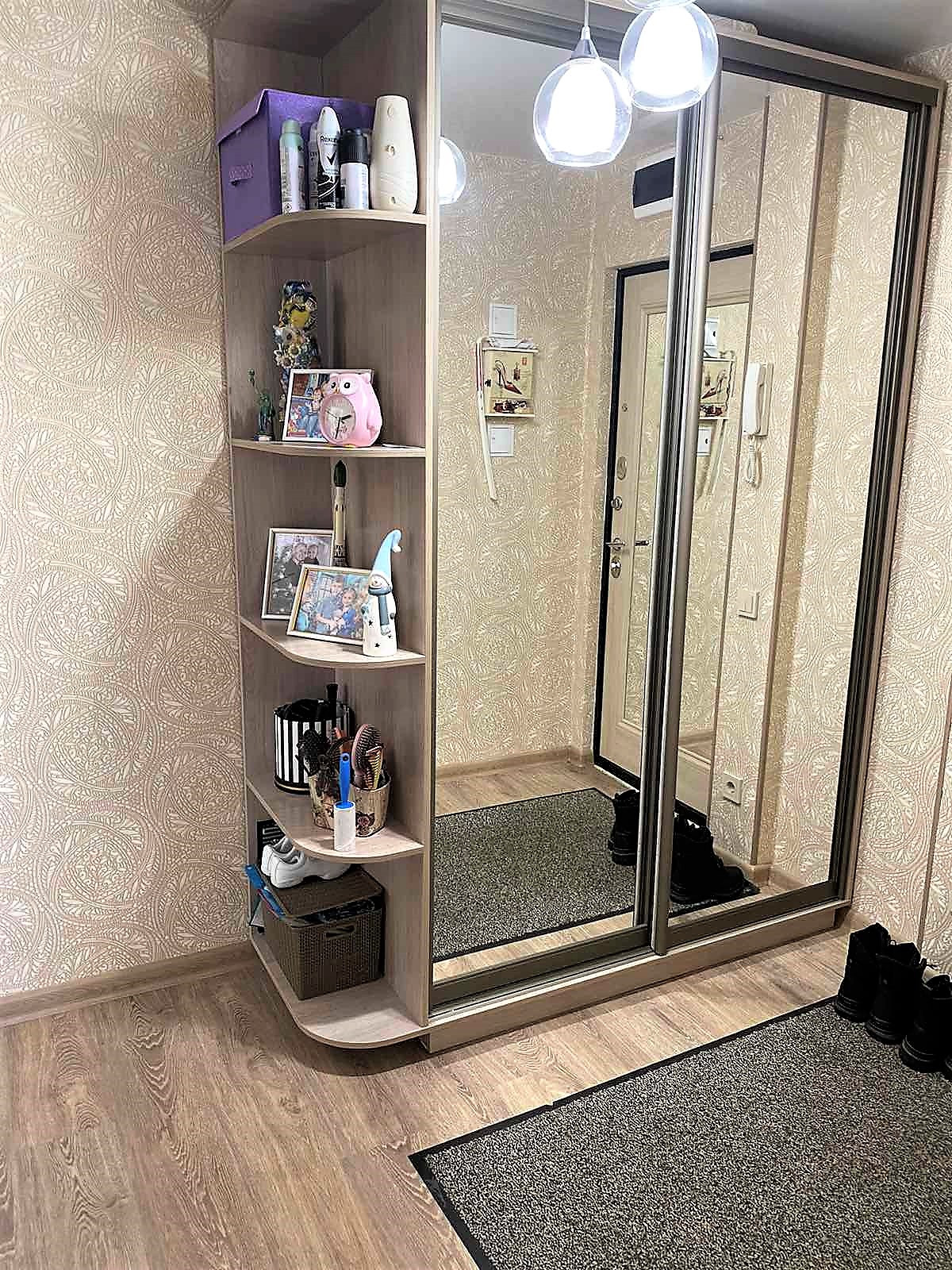 Большая прихожая , установлен шкаф для хранения верхней одежды и обуви. На кухне качественный кухонный гарнитур с техникой.