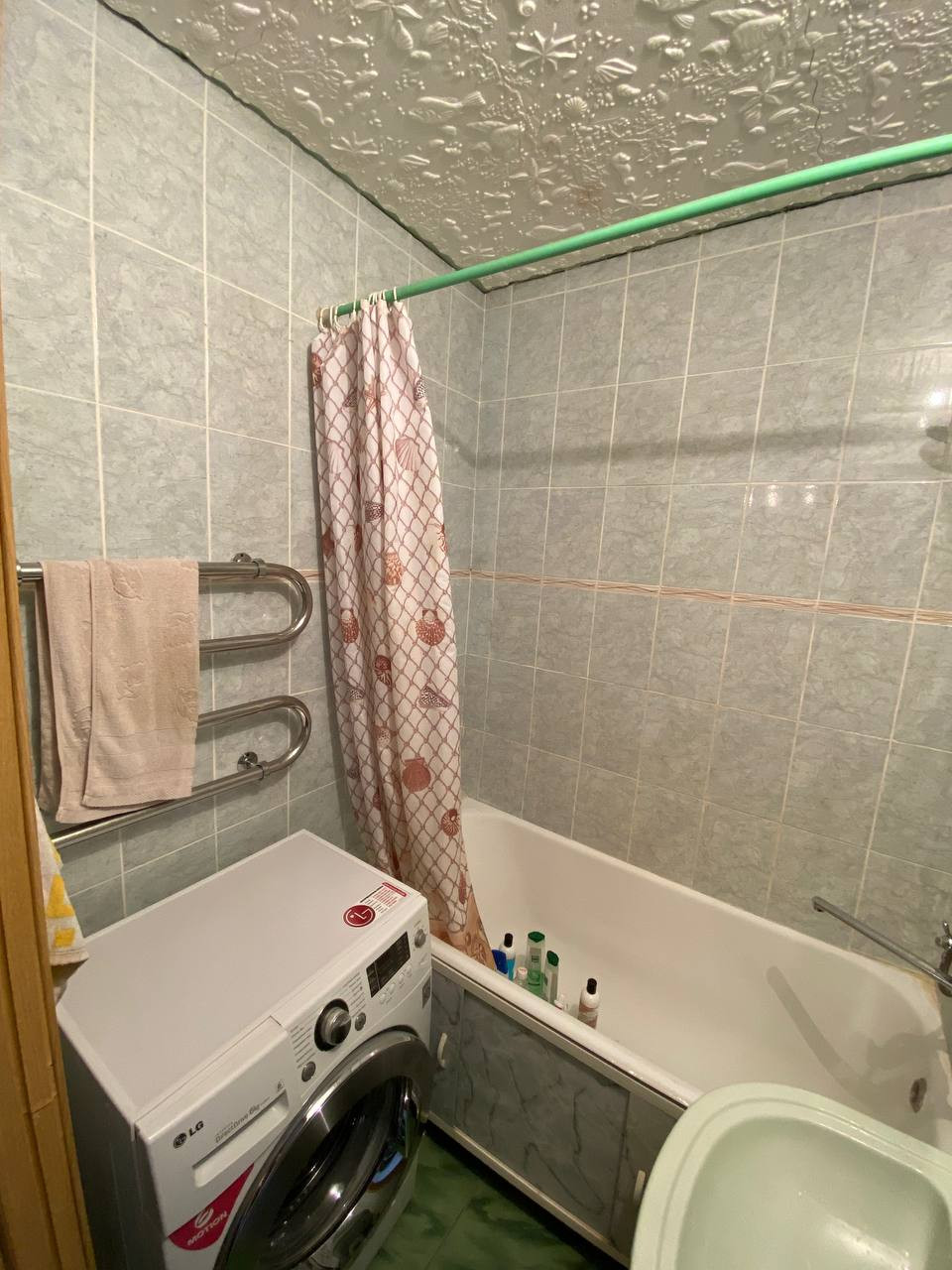 Ванная комната в плитке, ванная чаша – чугунная.