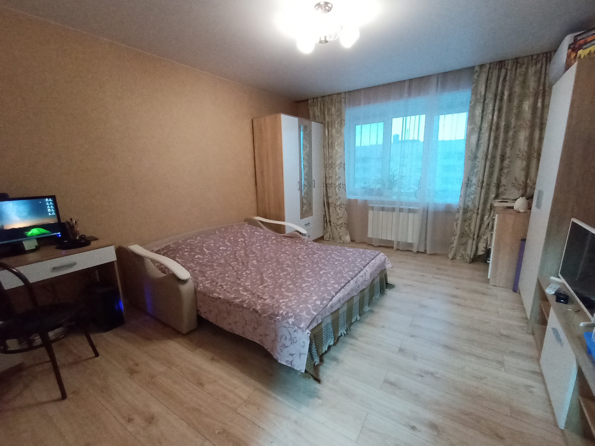 Квартира со свежим качественным ремонтом (делали для себя). Из мебели остается кухонный гарнитур, встроенный гардероб в кладовке, кондиционер. Все окна пластиковые, пол выровнен, ламинат, на кухне и в прихожей на полу плитка, трубы поменяны, в комнате заменен радиатор, натяжные потолки в комнате, кухне, прихожей, новая входная дверь, счетчик на газ. Спокойные соседи. Один собственник. Долгов и обременений нет. Быстрый выход на сделку. Без альтерната. С агентами договор заключать не будем. Не беспокоить.