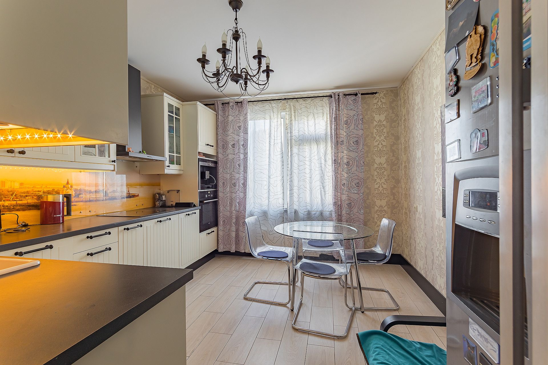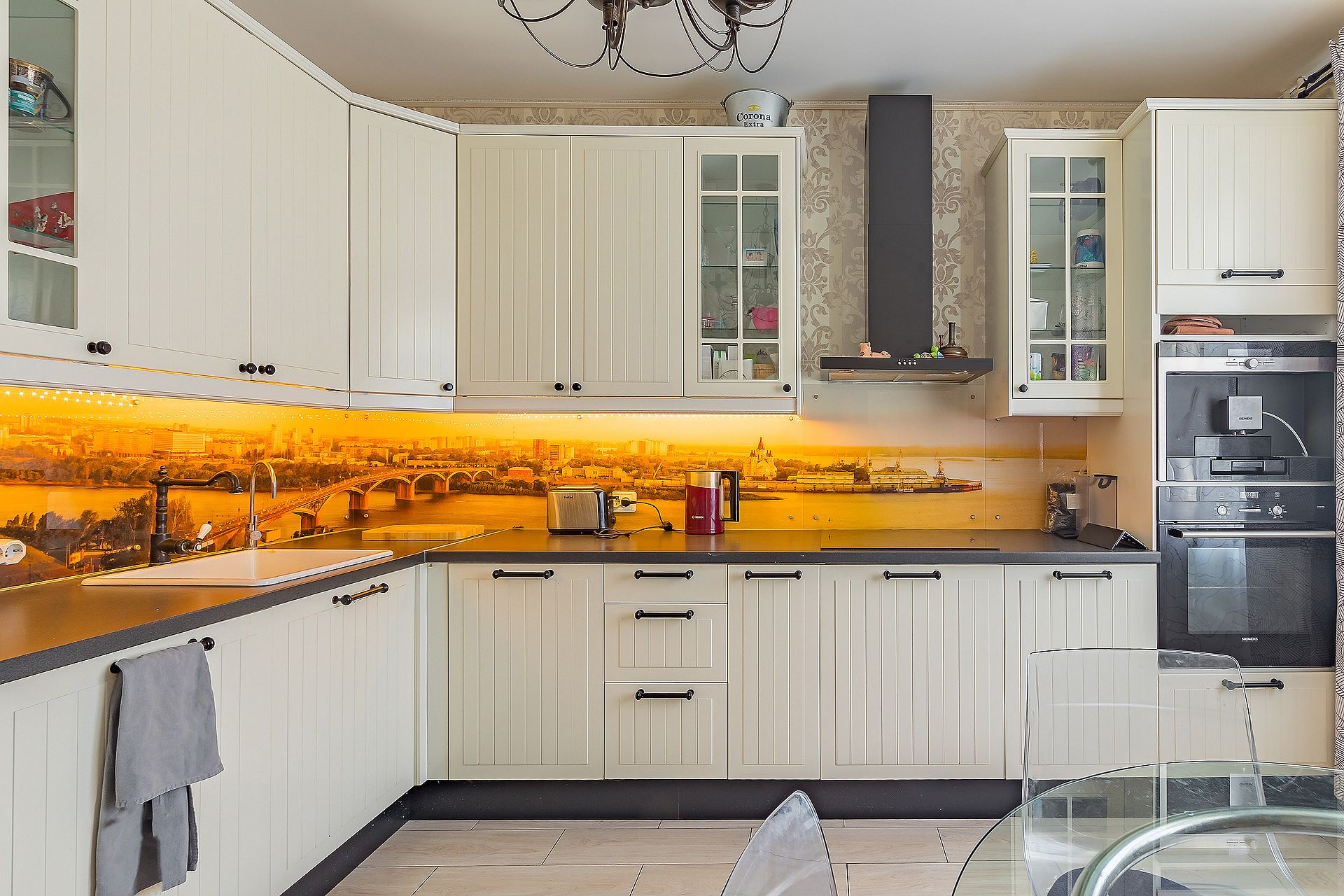 - большая кухня оборудована полным комплектом бытовой техники: посудомойка, духовка, плита, встроенная кофемашина, двухдверный холодильник с функцией ледогенератора (марки Siemens, Electrolux). Эксклюзивный рабочий фартук из закаленного стекла с панорамой Нижнего Новгорода. Встроенная система фильтров очистки воды обратного осмоса.
