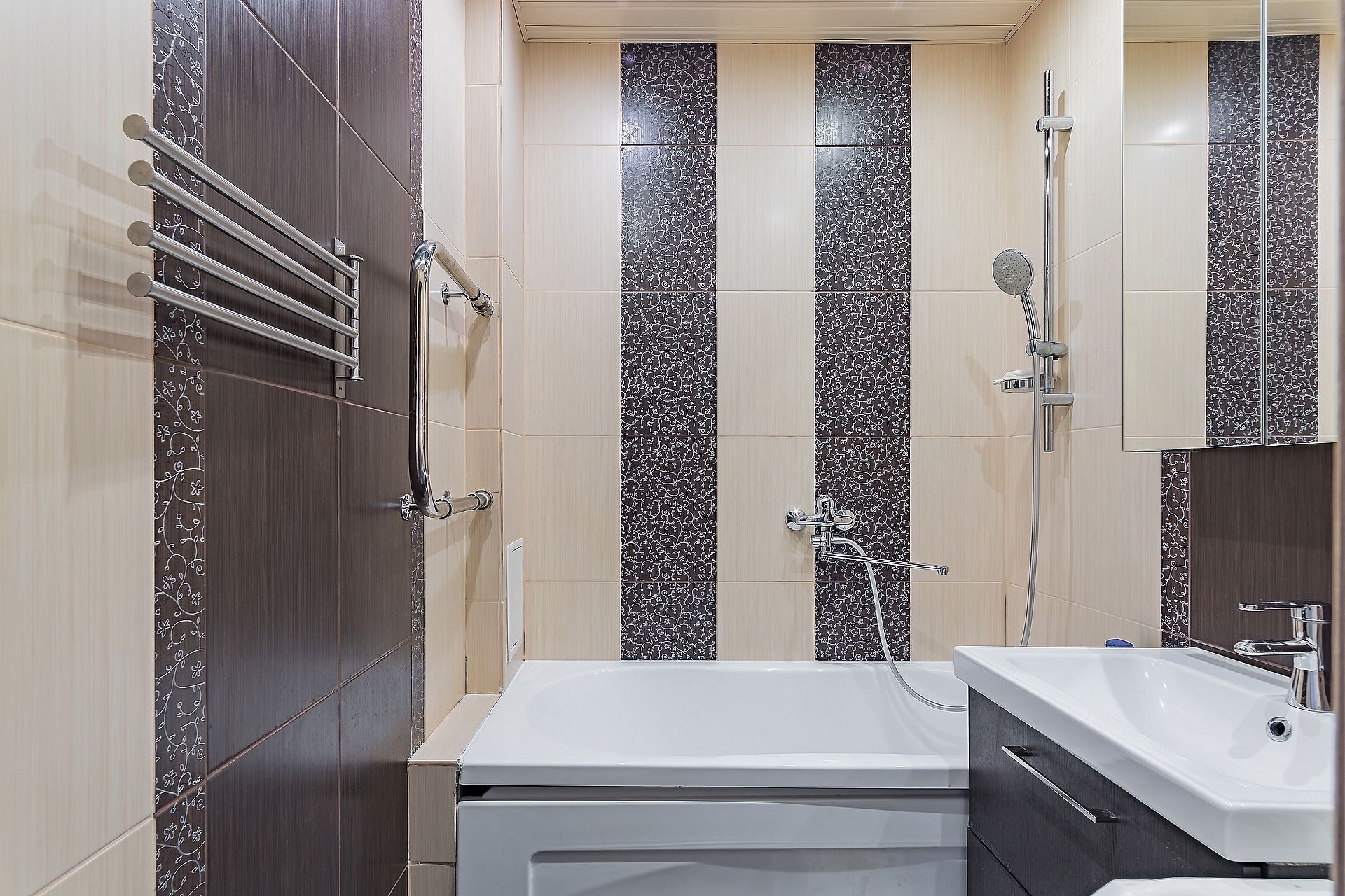 - на полу коридоров, кухни и в санузлах испанская плитка; в комнатах финская паркетная доска
