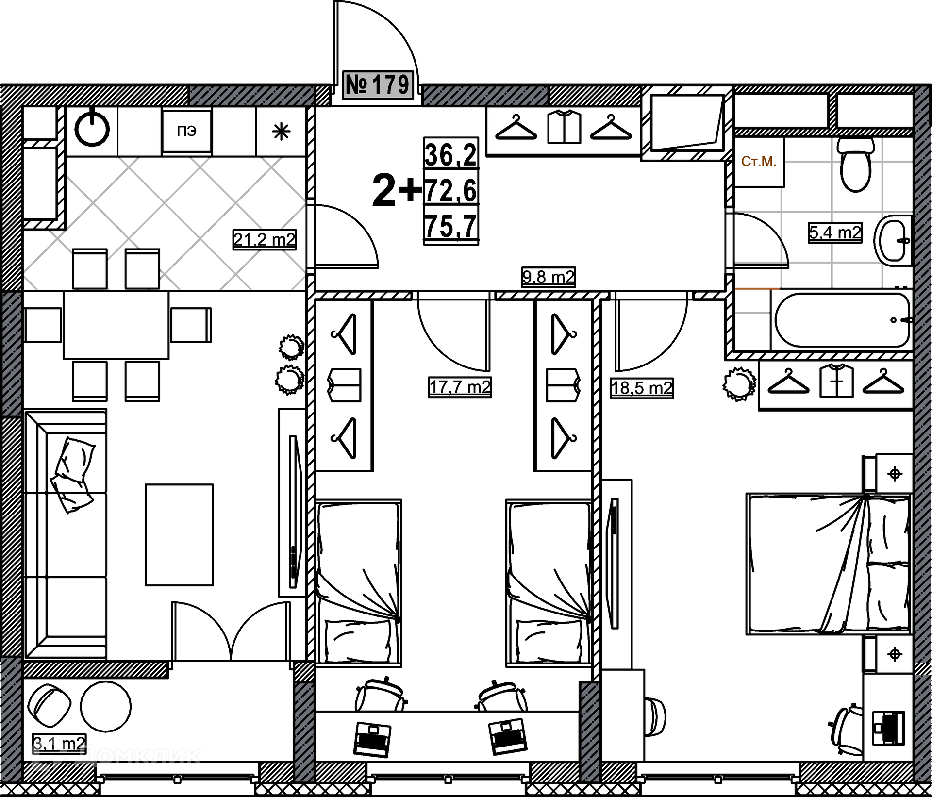 Общая площадь 75.7 м2