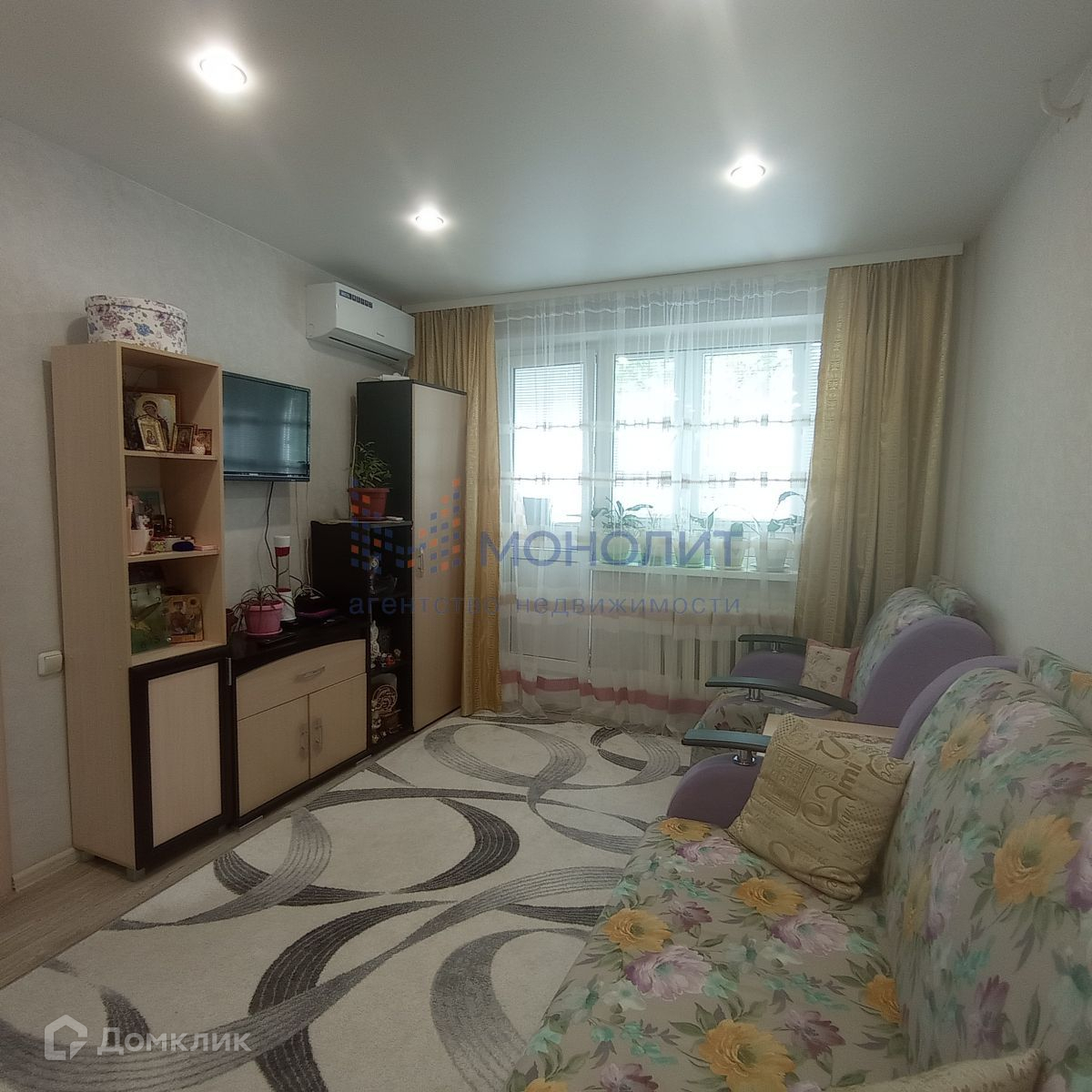 На полу линолеум, потолки натяжные, окна ПВХ, хорошие межкомнатные и входная двери, застекленный балкон, кондиционер.
