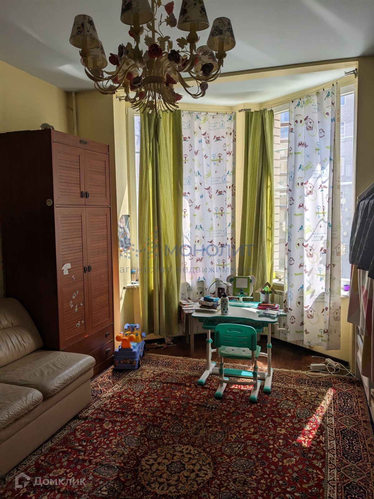 Потолки 3 метра. Окна выходят в тихий уютный двор. Большие окна, эркер