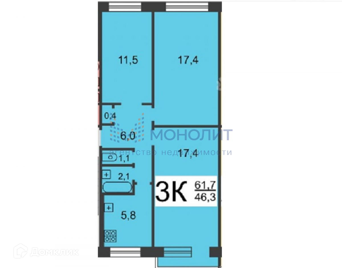 Жилая площадь 46.3 м2