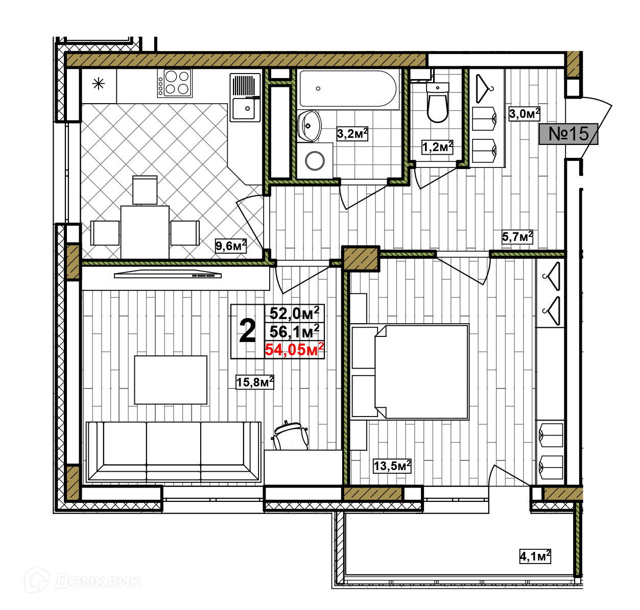 Общая площадь 54.05 м2