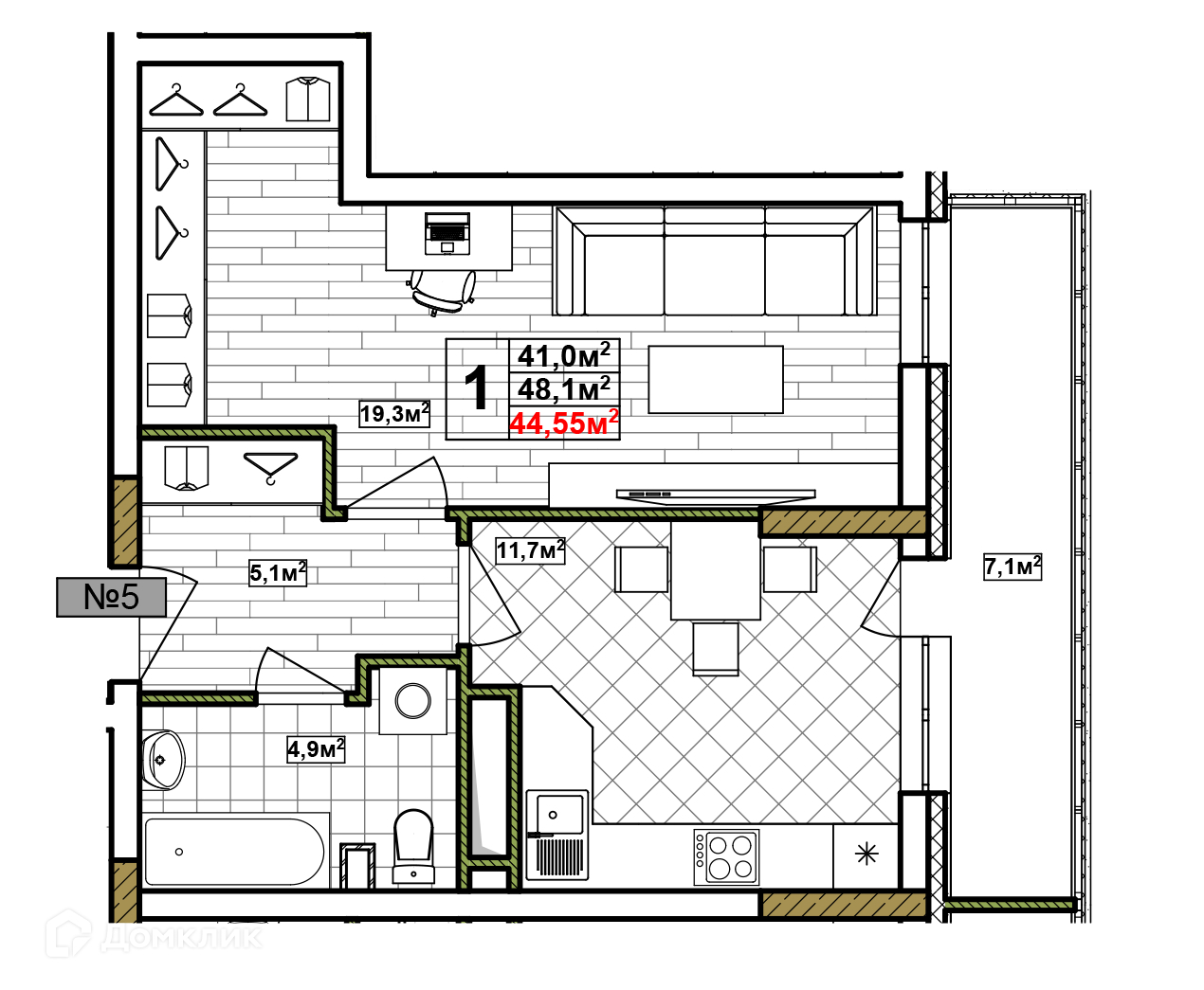 Общая площадь 44.55 м2