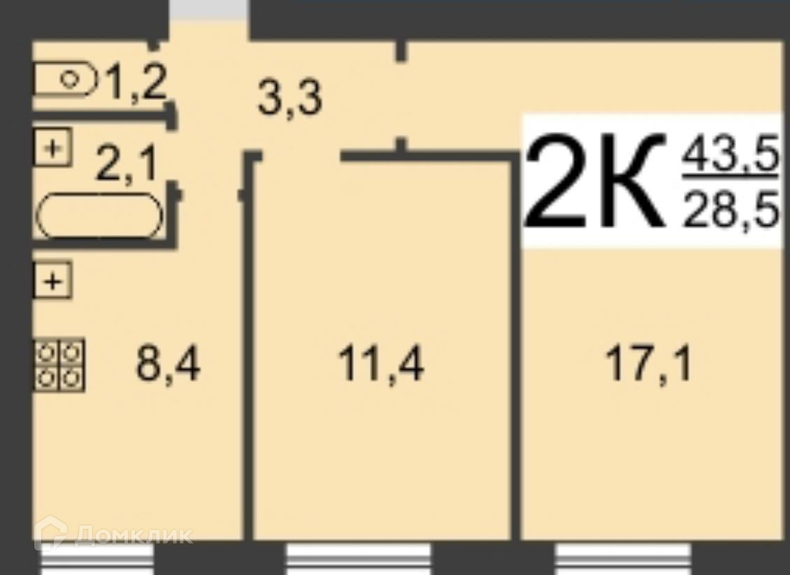 Жилая площадь 28.5 м2