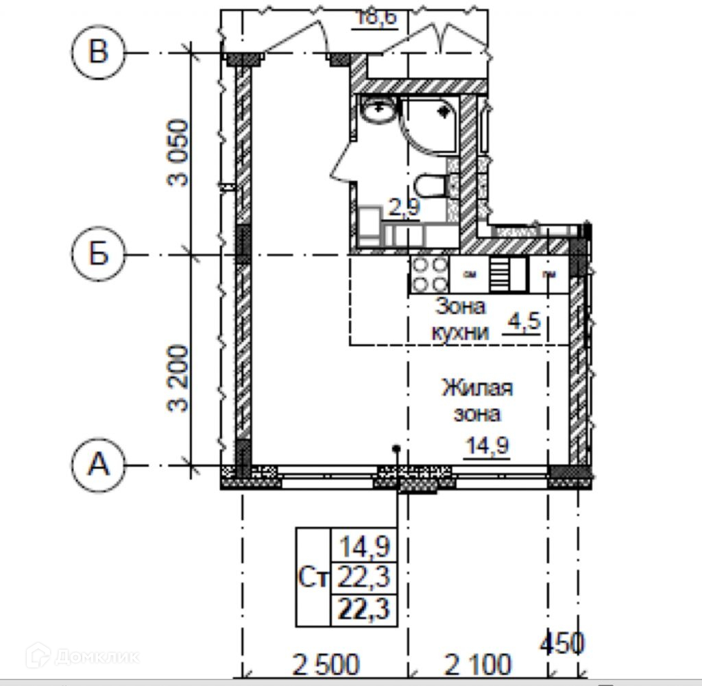 Общая площадь 22.3 м2