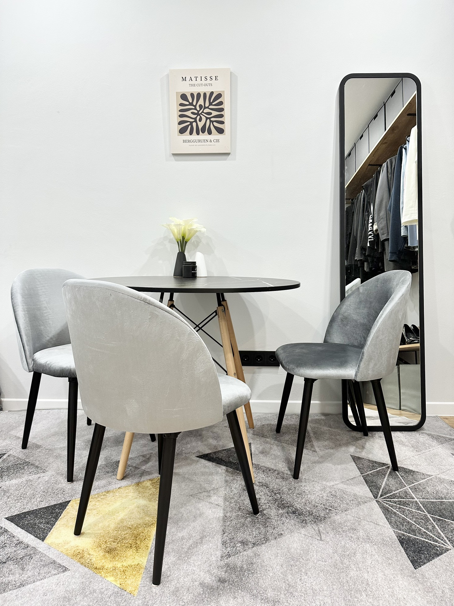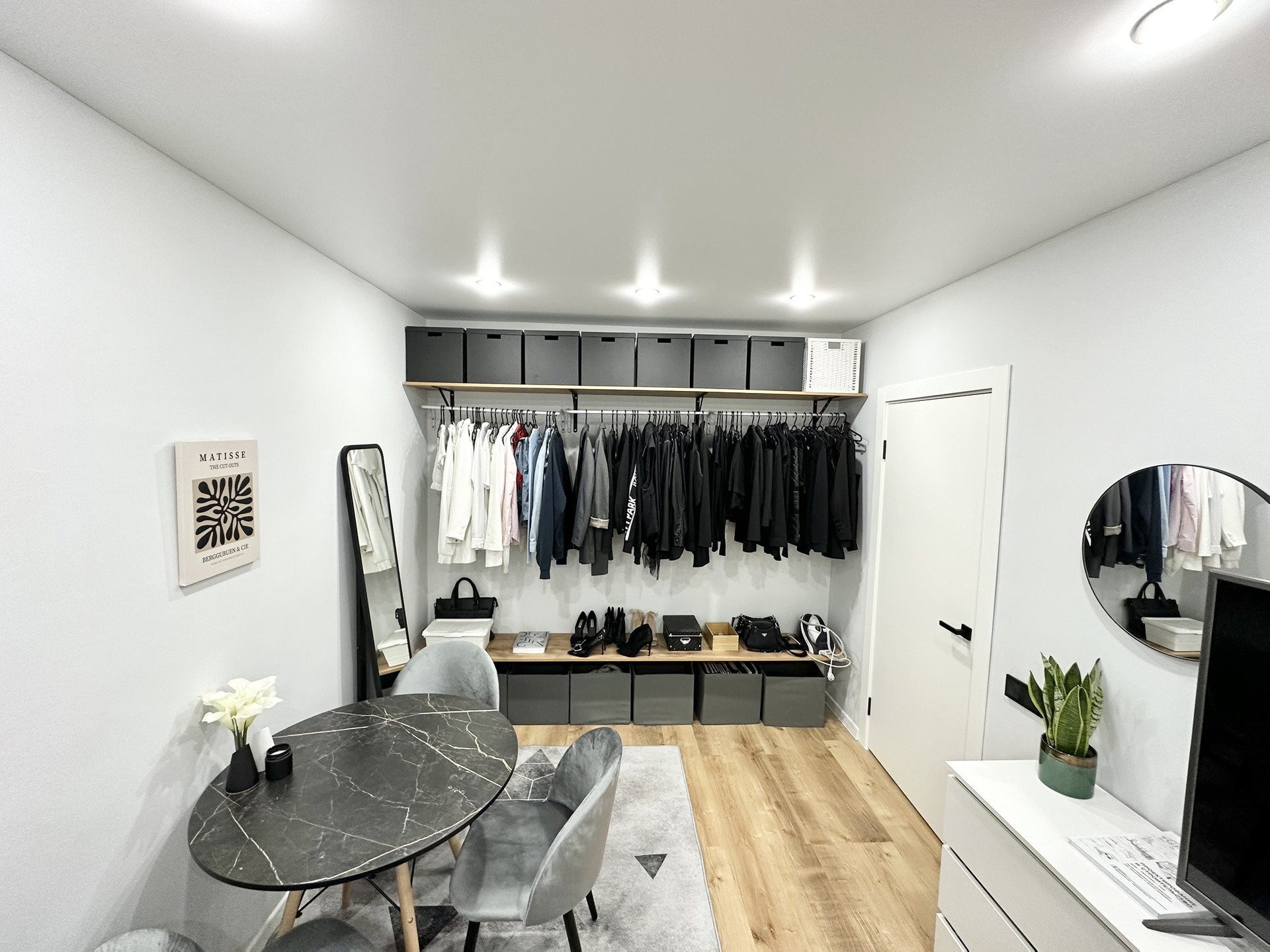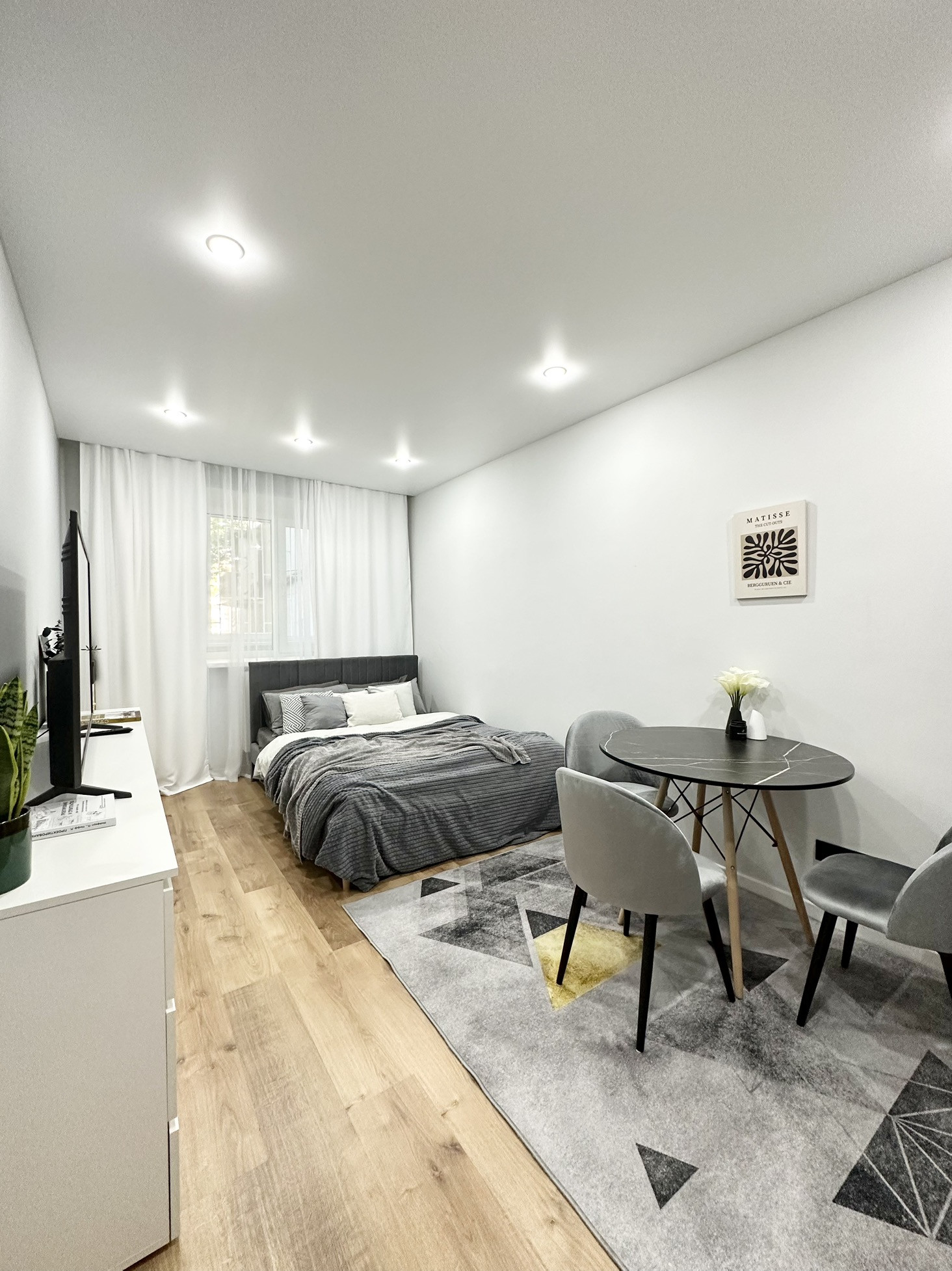 В квартире остаётся вся мебель и техника как на фото: кухонный гарнитур, вешала и полки в гардеробных системах, кровать, матрас, комоды, обеденный стол, 3 стула, телевизор, занавески, зеркальное панно в прихожей, холодильник, стиральная машина, электрический чайник, микроволновка, духовая печь, индукционная плита, барная стойка, барные стулья (2 шт).