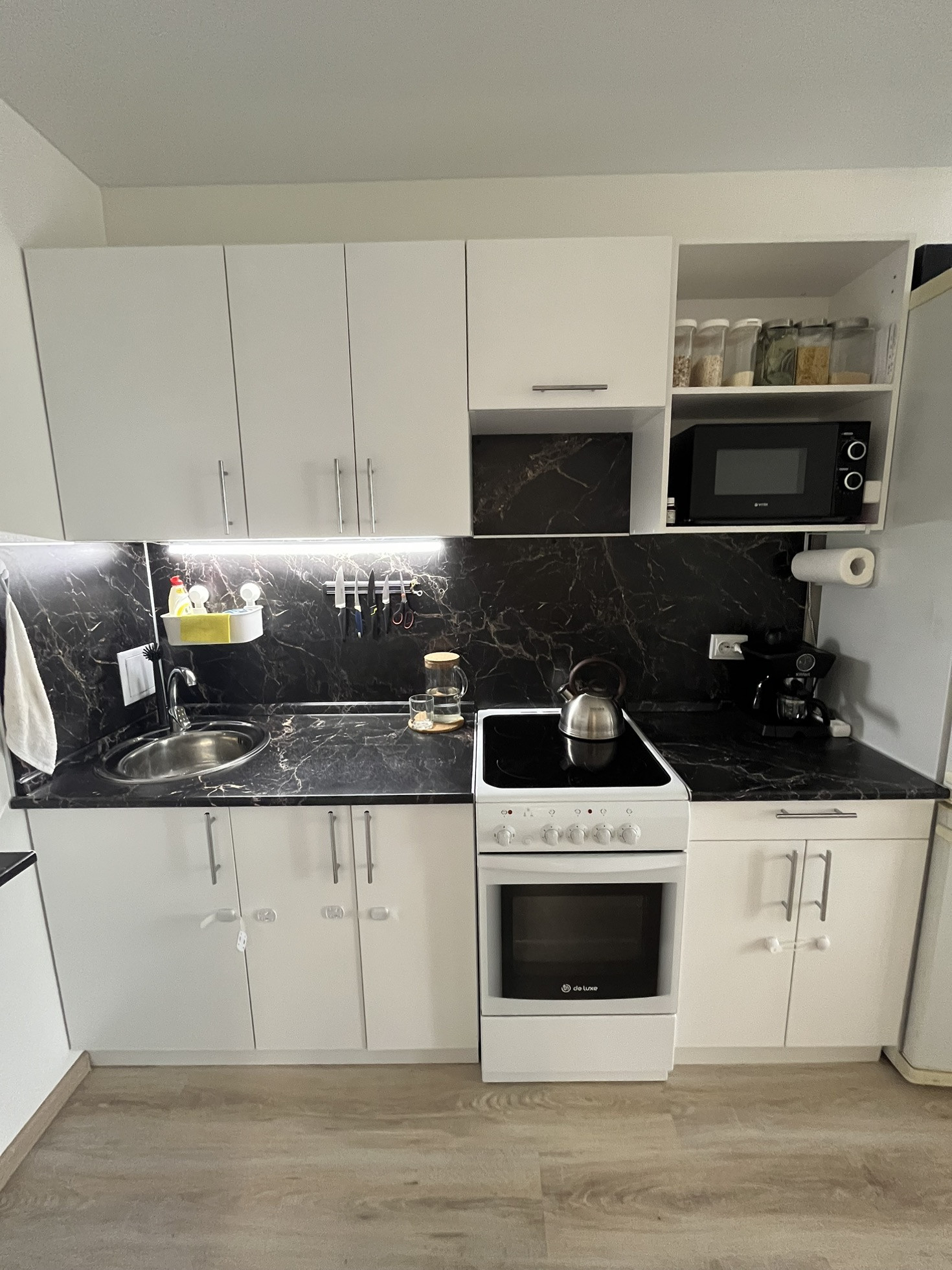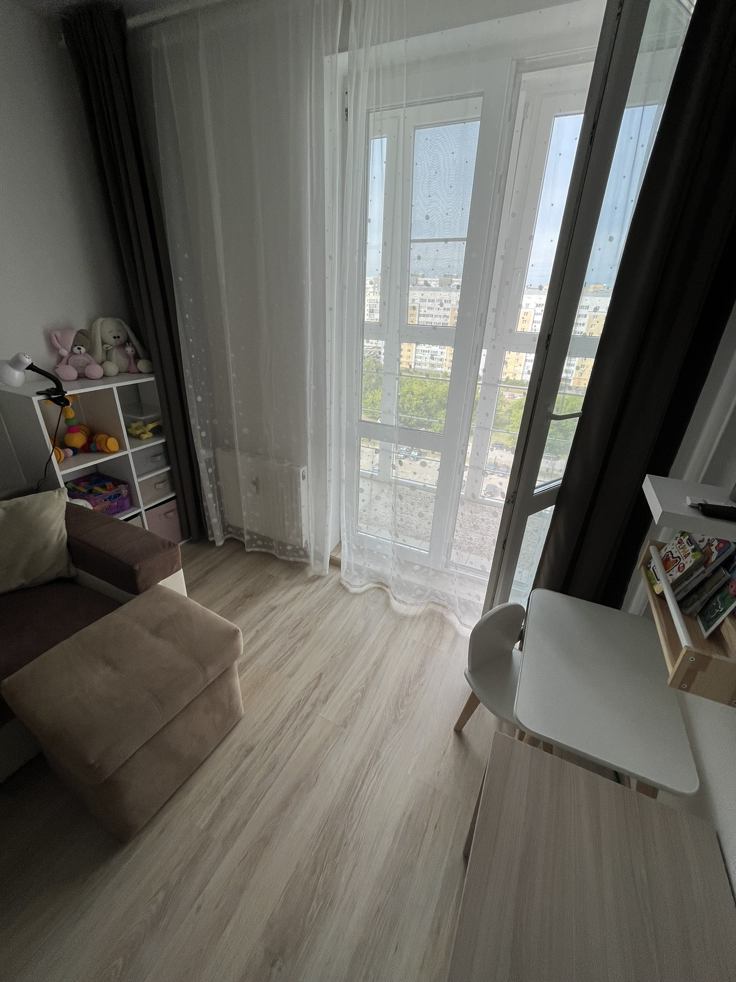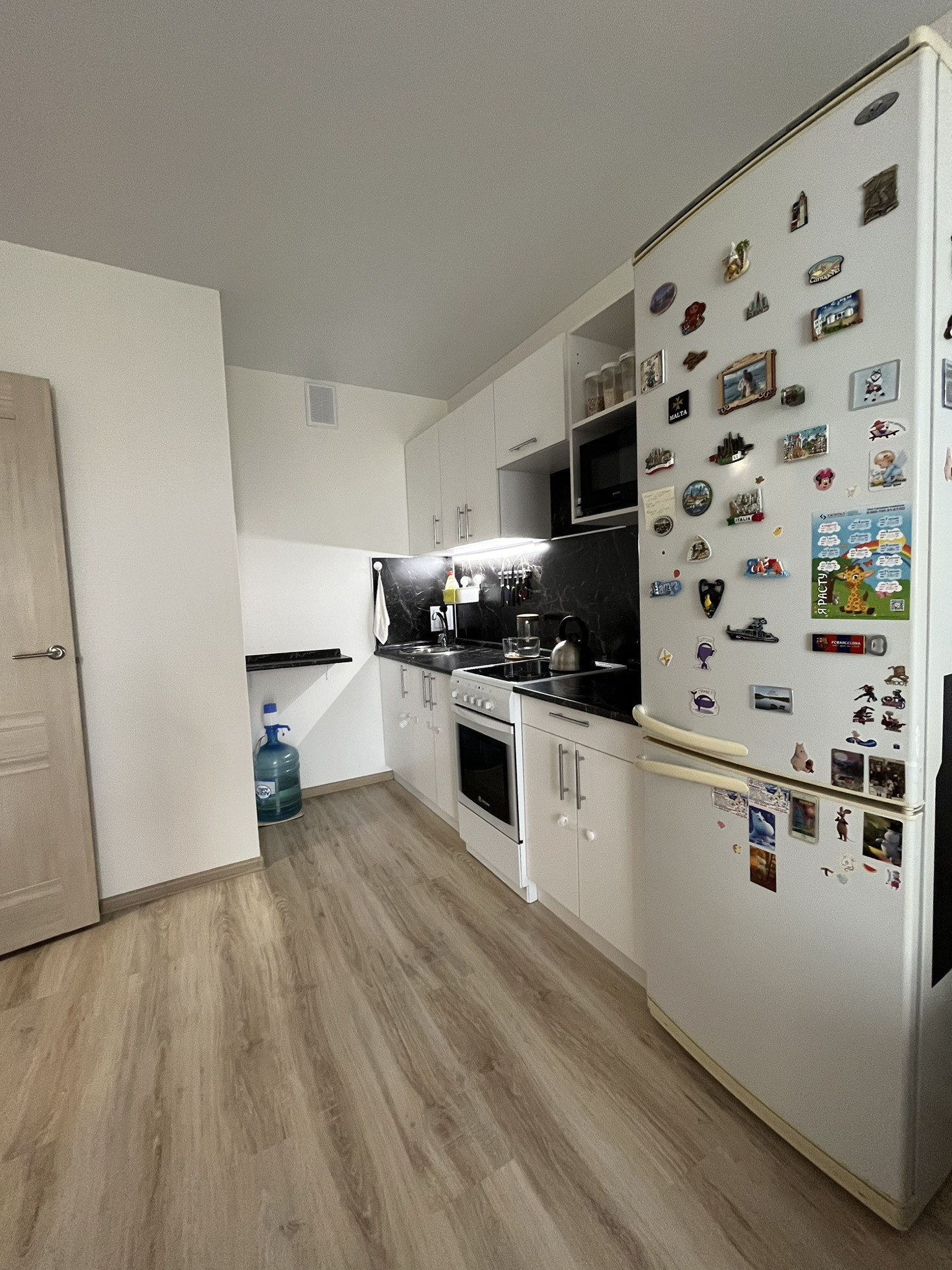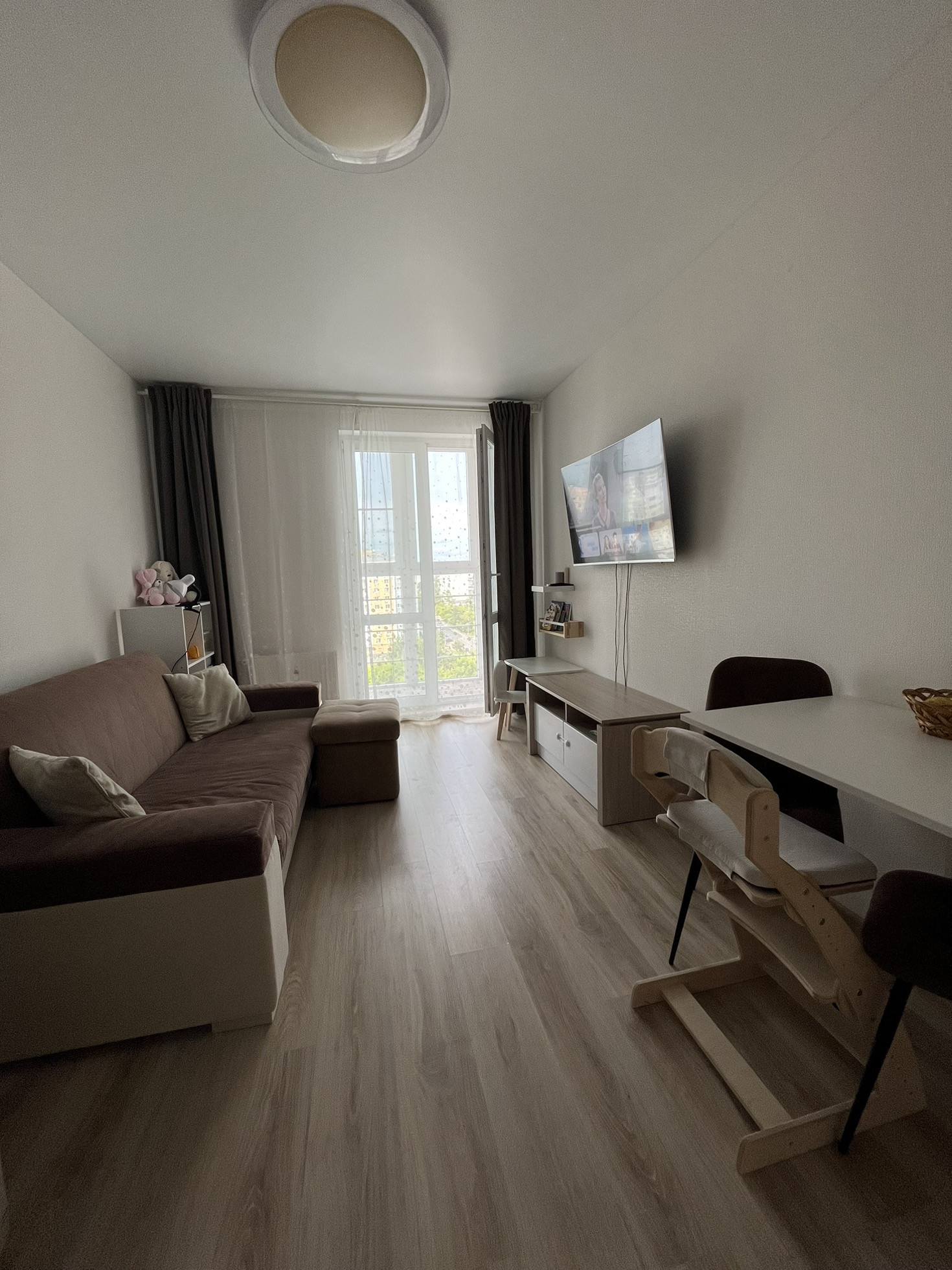 Кухня- гостиная с панорамным балконом   ( 18м2). Встроенный кухонный гарнитур с электрической плитой, есть стол, стулья, диван и холодильник - останется новым владельцам. Заезжай и живи.