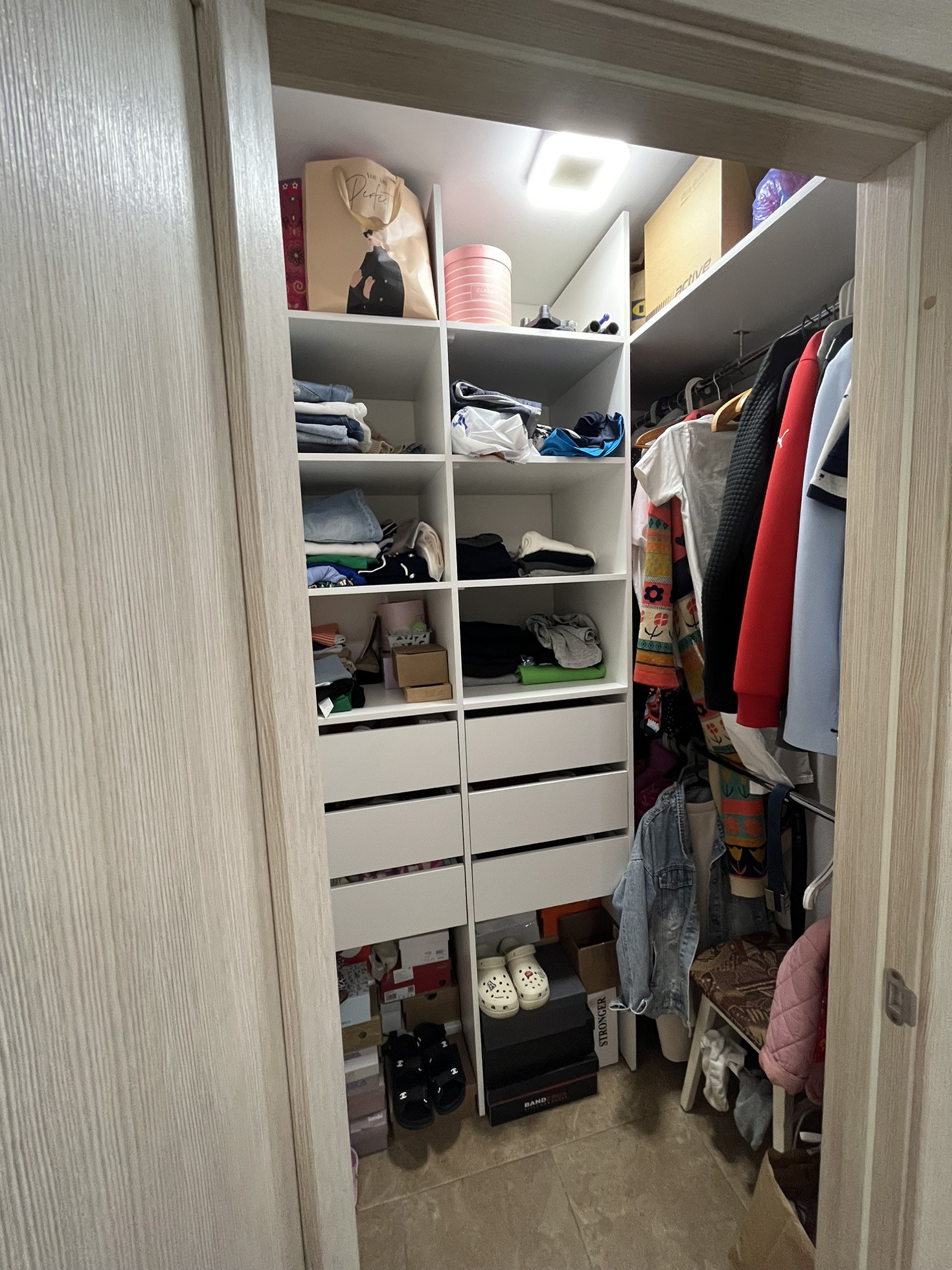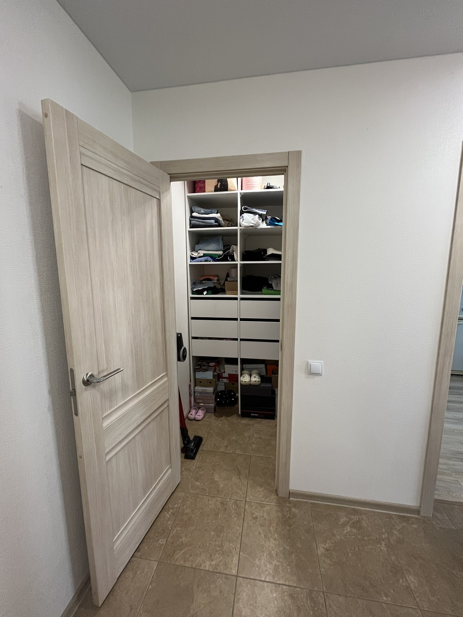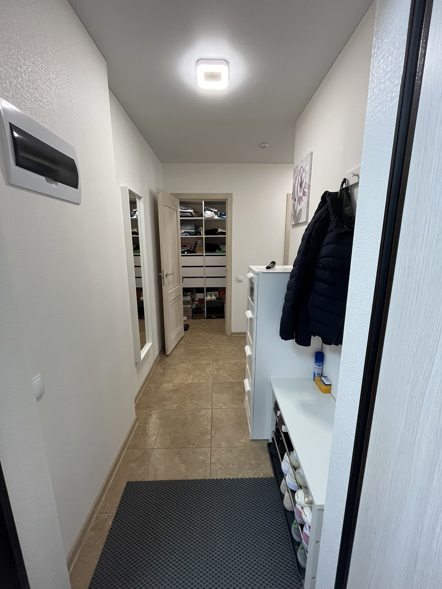 Просторная прихожая. Встроенная гардеробная, дает вместить в себя все, что не требует отдельных шкафов.