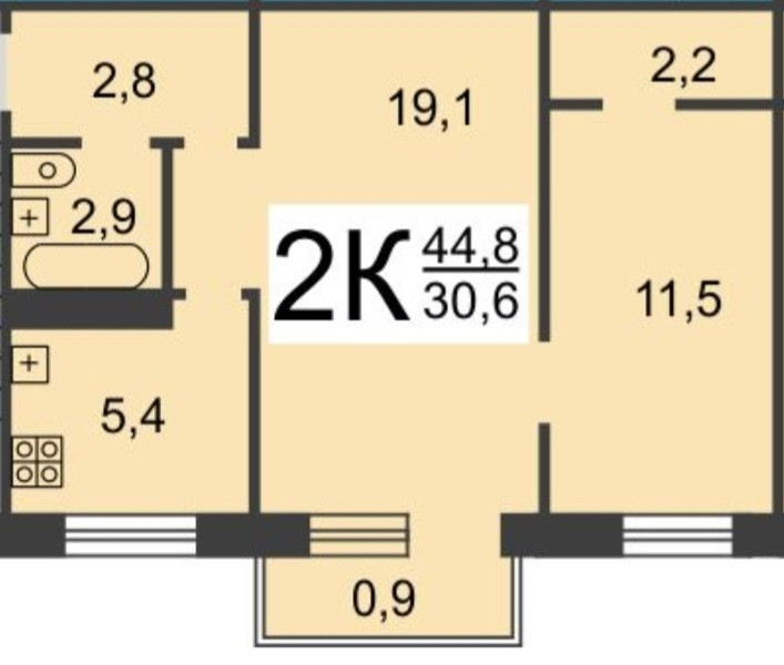 Общая площадь 44.8 м2
