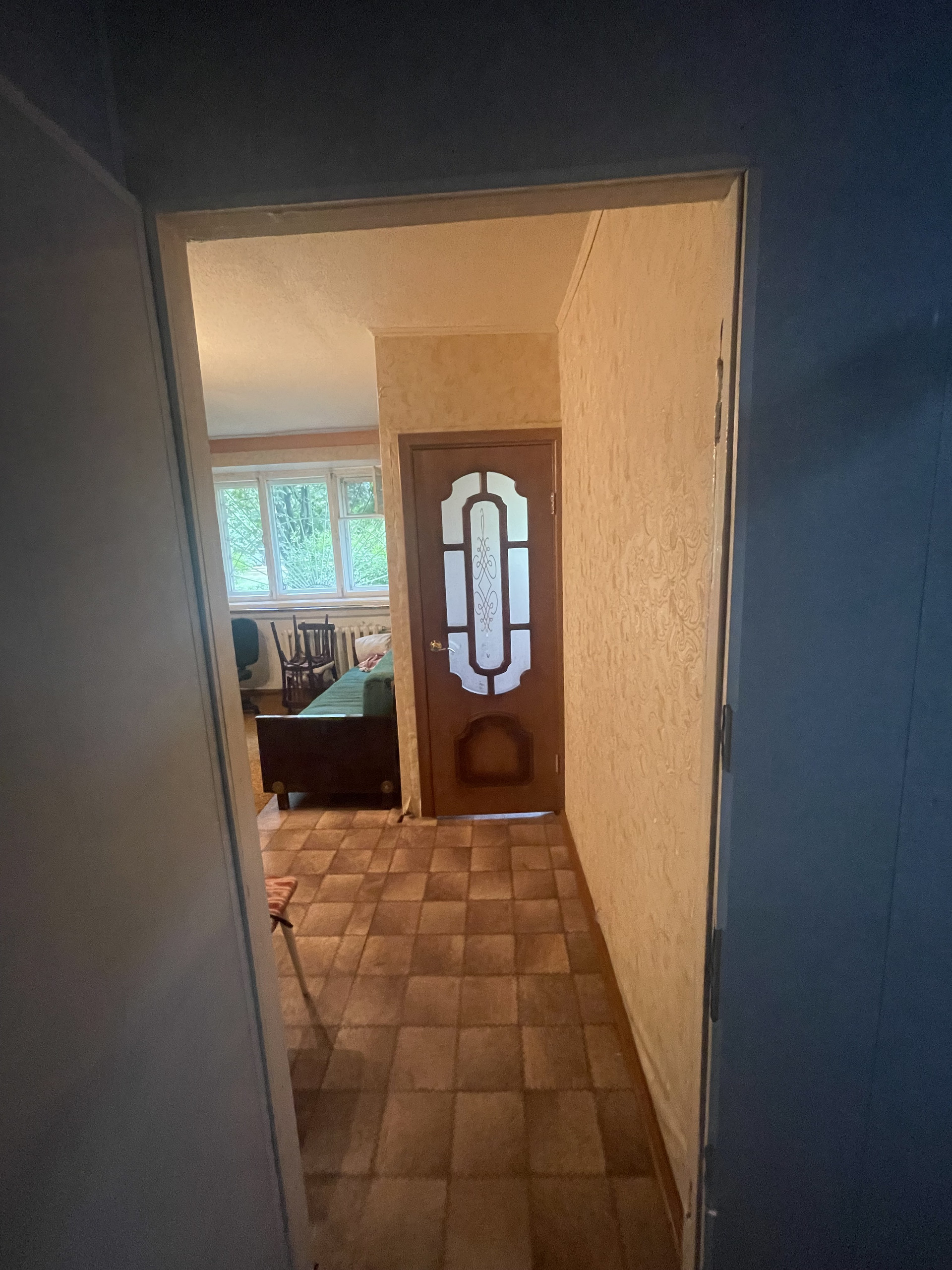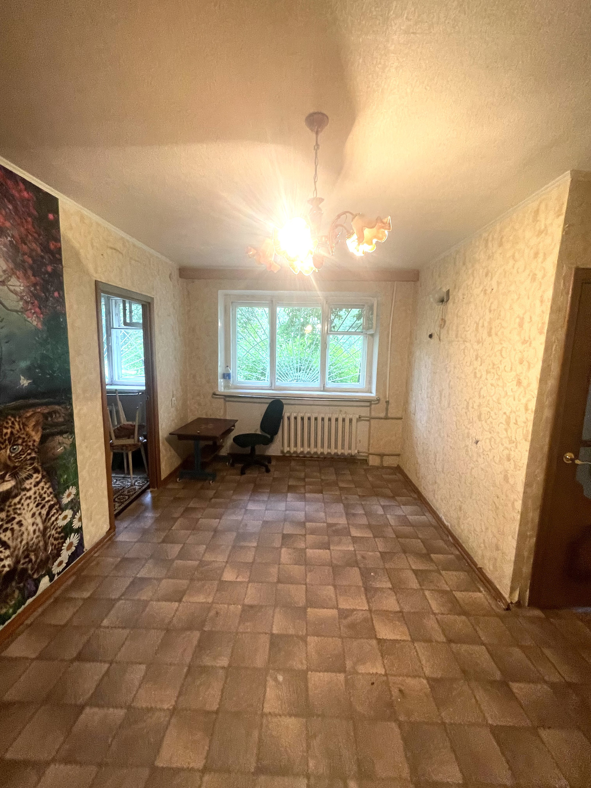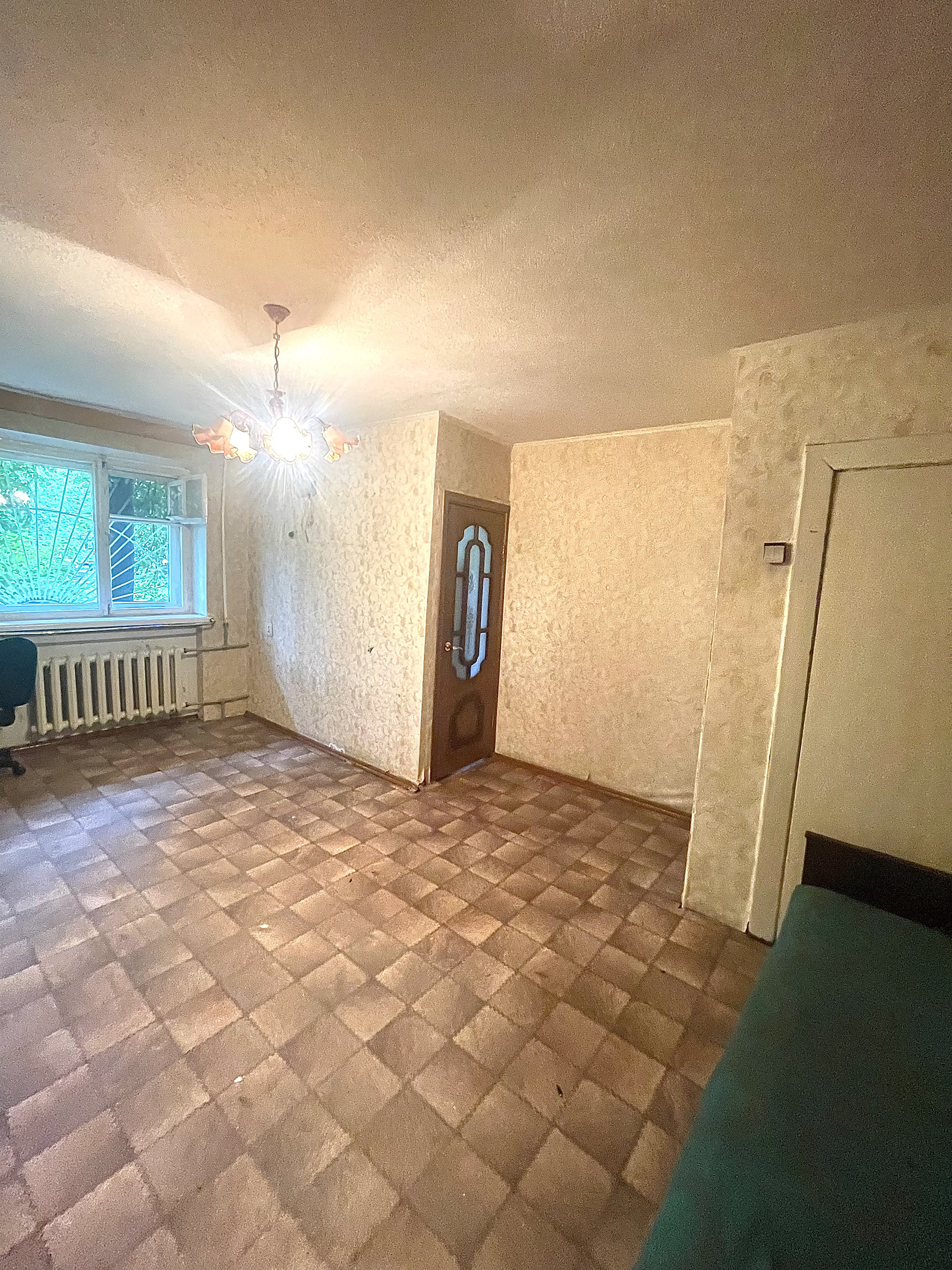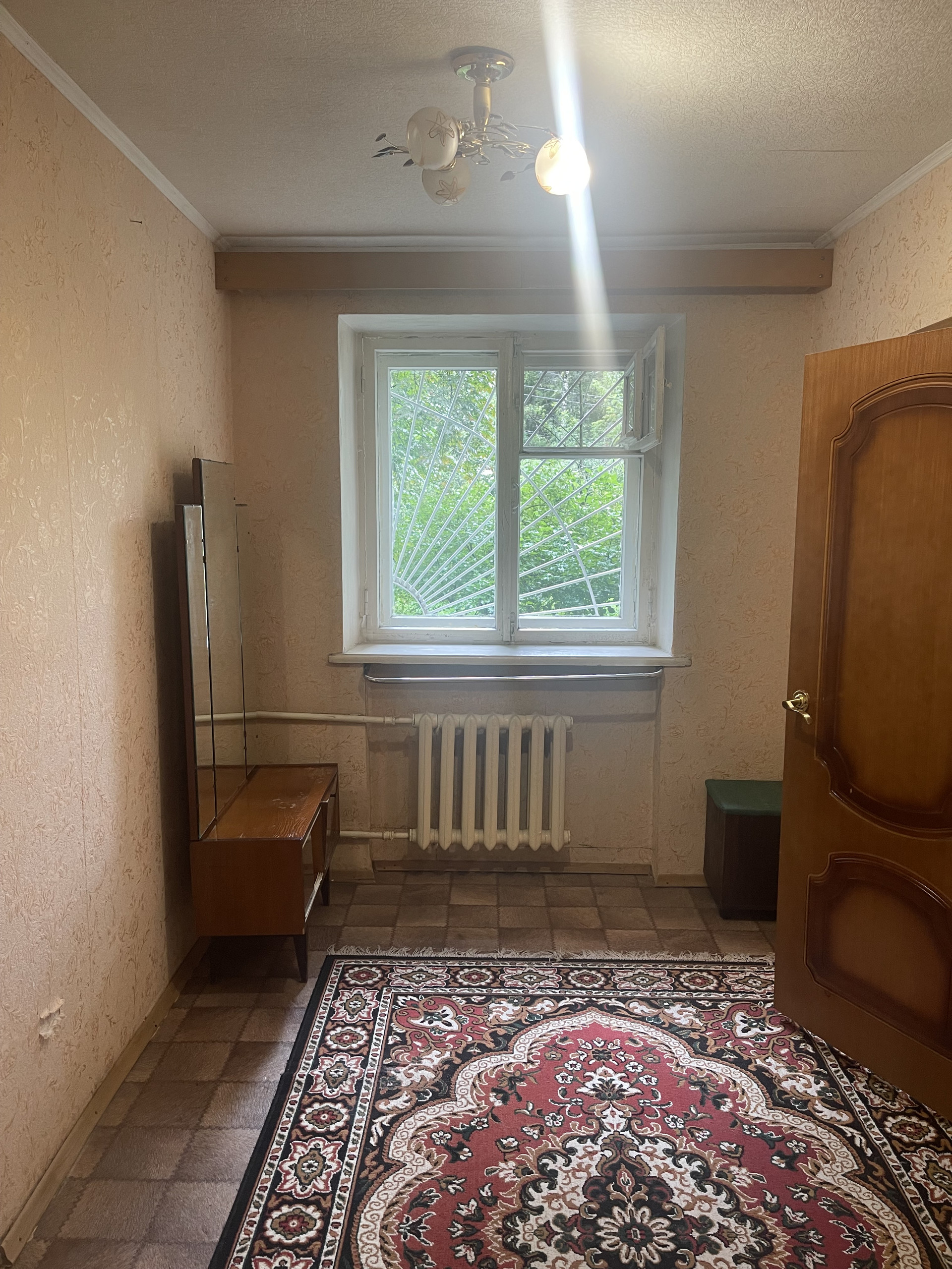 Прихожая просторная, широкая – 5,2 кв.метров. дом кирпичный, окна высоко, на окнах решетки. Можно перепланировать в трехкомнатную квартиру, есть кладовка.