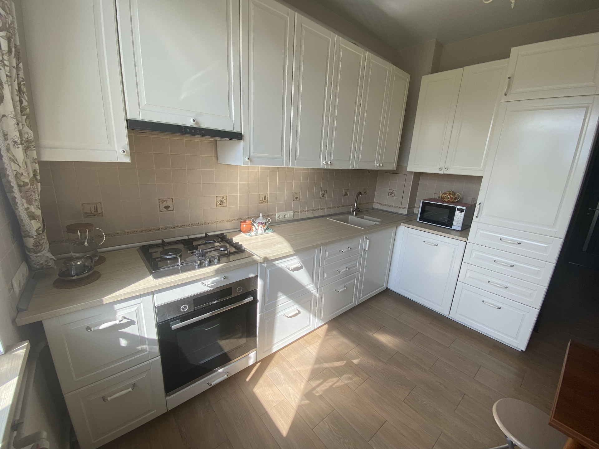 - оставляем кухонный гарнитур Икеа с встроенной техникой Bosch;